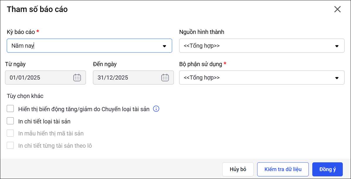 - In chi tiết loại tài sản: Tích chọn nếu muốn thể hiện chi tiết tên tài sản trên báo cáo.