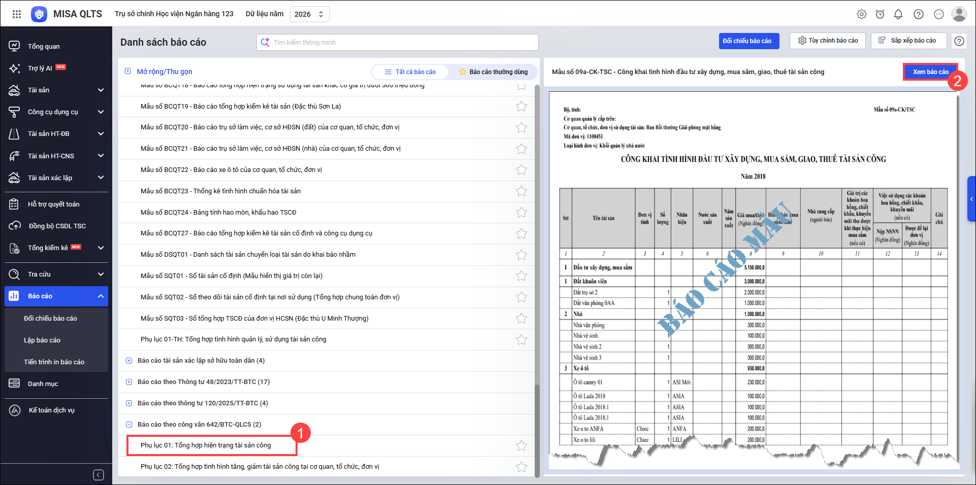 Phần mềm QLTS bổ sung 2 mẫu báo cáo công khai theo Công văn 642/BTC-QLCS như sau:
