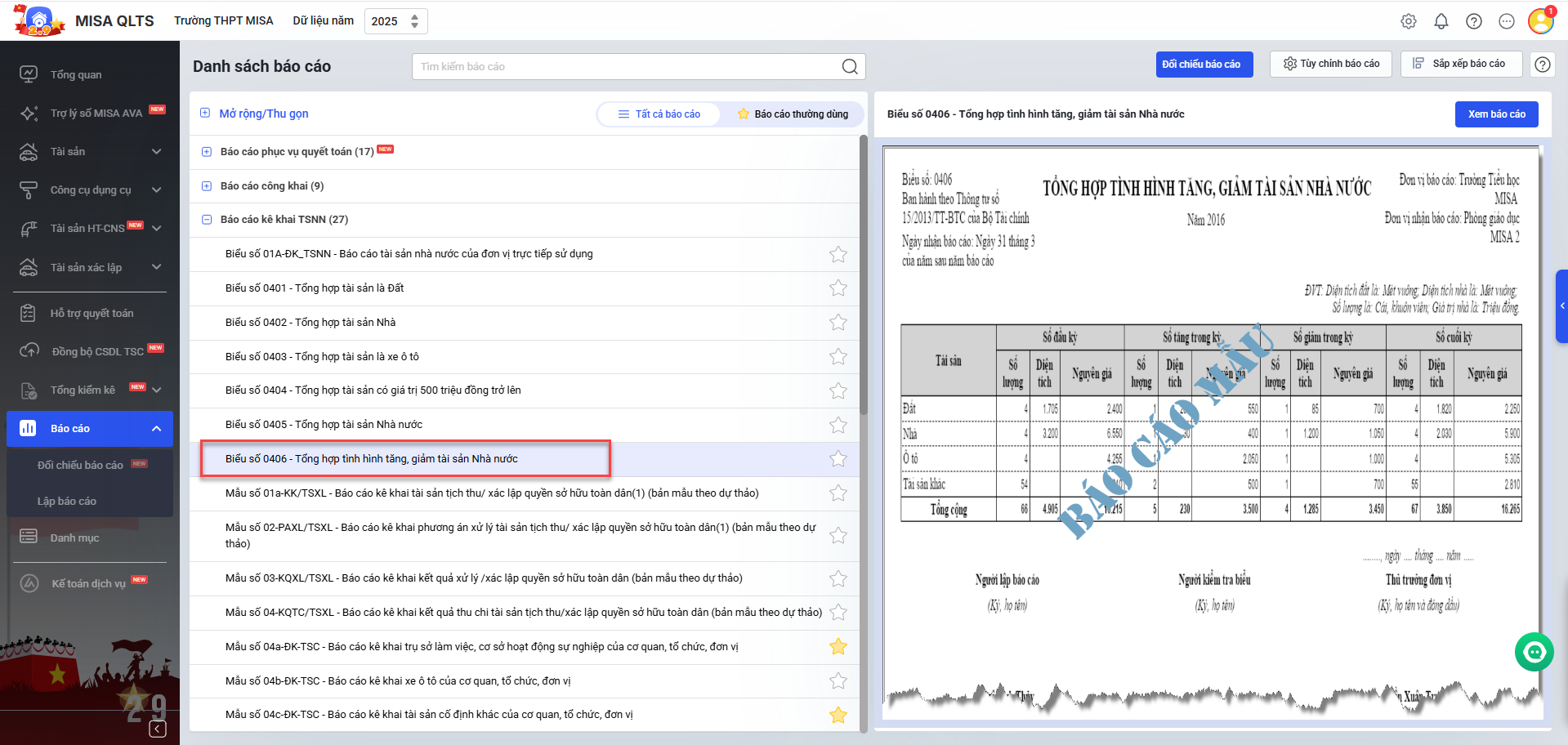 Bước 1: Vào menu Báo cáo, chọn Báo cáo kê khai TSNN, tại đây phần mềm đã bổ sung Báo cáo Biểu số 0406 – Tổng hợp tình hình tăng, giảm tài sản Nhà nước.