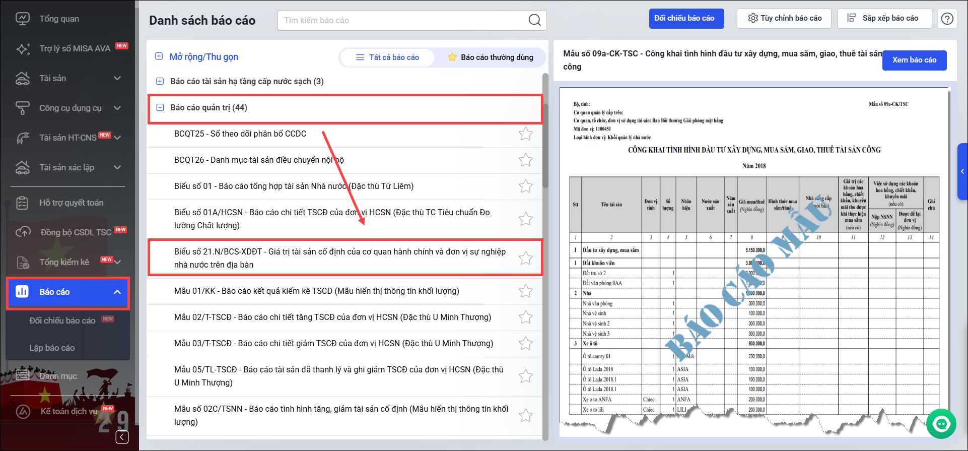 Bước 1: Vào menu Báo cáo\Báo cáo quản trị\chọn Biểu số 21.N/BCS-XDDT – Giá trị tài sản cố định của cơ quan hành chính và đơn vị sự nghiệp nhà nước trên địa bàn.