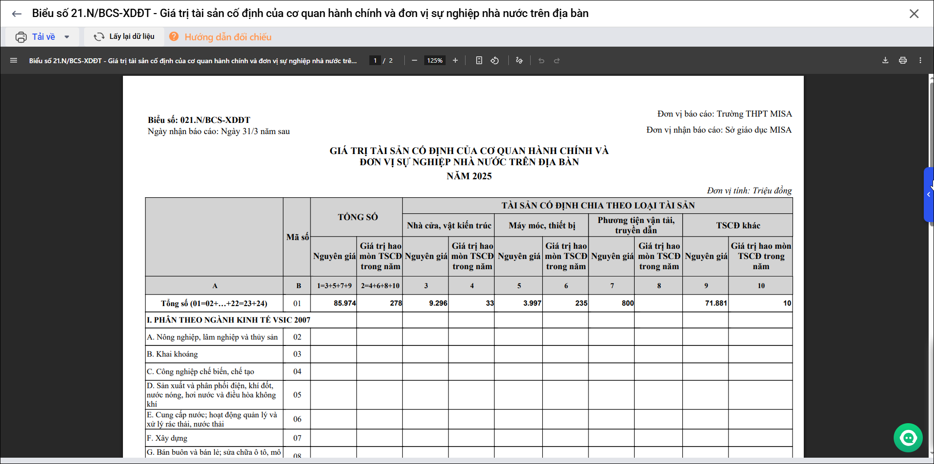 Bài viết này giúp anh/chị in được Biểu số 21.N/BCS-XDDT – Giá trị tài sản cố định của cơ quan hành chính và đơn vị sự nghiệp nhà nước trên địa bàn. Báo cáo này giúp tổng hợp và theo dõi tình hình quản lý, sử dụng, và biến động về giá trị tài sản cố định (TSCĐ) của các cơ quan nhà nước, đơn vị sự nghiệp công lập trên địa bàn theo định kỳ.