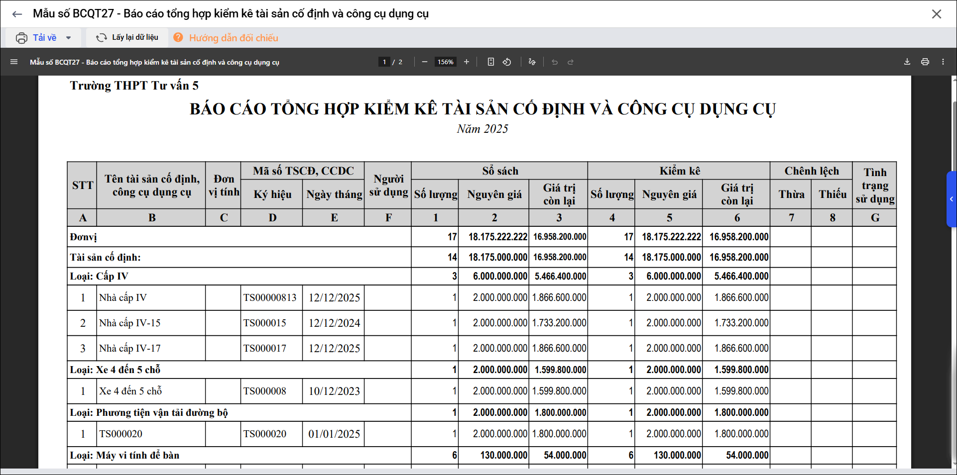 Nội dung báo cáo phản ánh về số lượng, nguyên giá, giá trị còn lại theo sổ sách và theo thực tế kiểm kê; chênh lệch thừa thiếu, tình trạng sử dụng.
