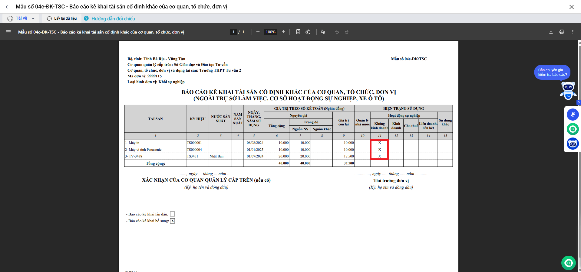 - Khi thay đổi thông tin tài sản con trong lô cha tại menu Báo cáo: Lúc này báo cáo cập nhật thông tin Hiện trạng sử dụng mới nhất cho tất cả tài sản con trong lô.