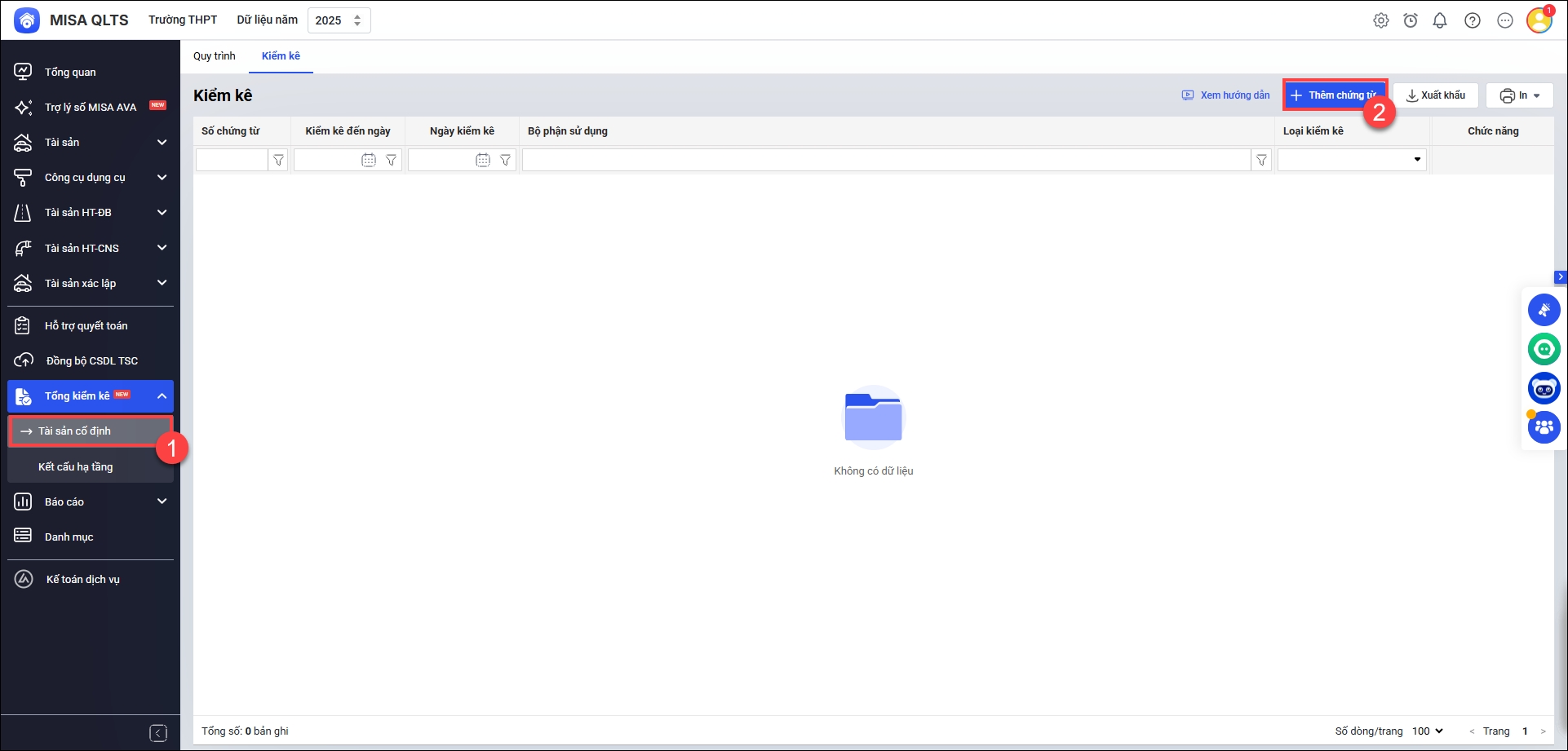- Vào Tổng kiểm kê/Tài sản cố định/Thêm chứng từ