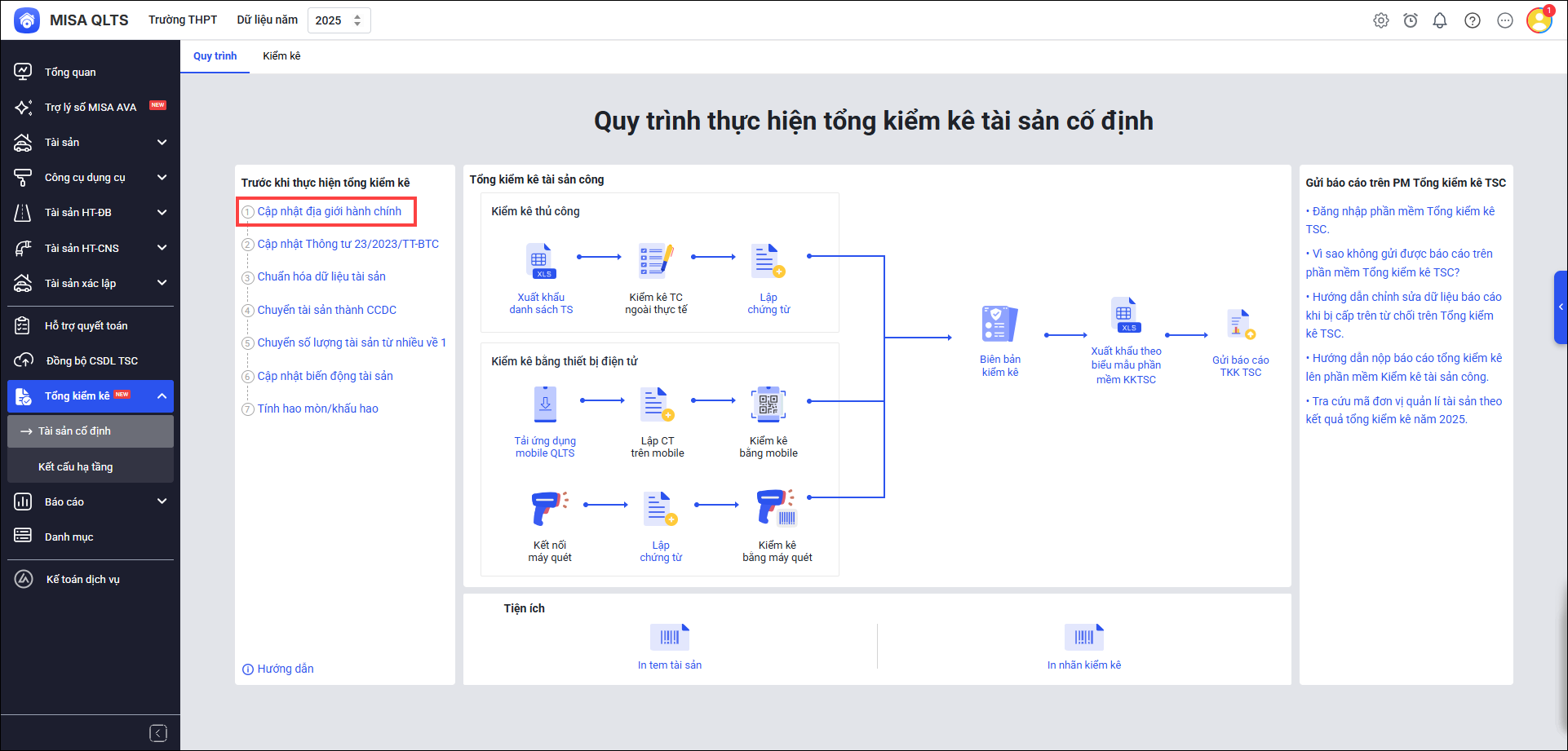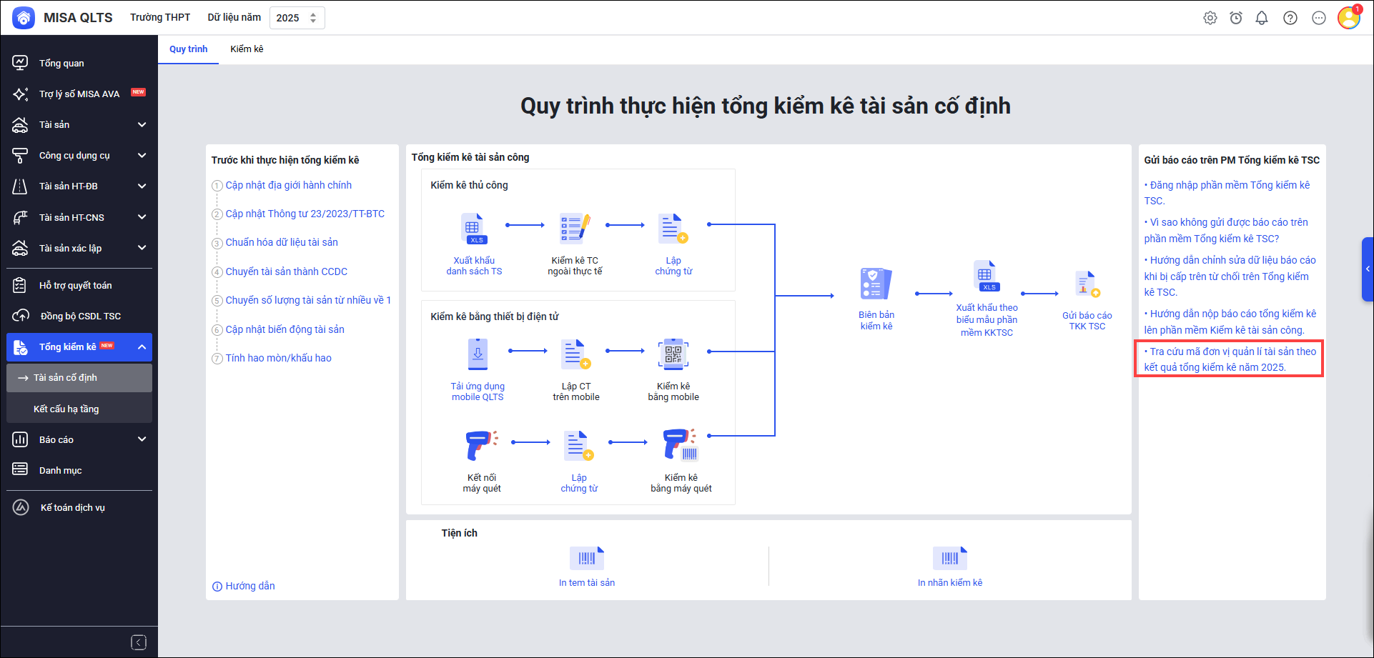 - Bổ sung bước Tra cứu thông tin mã đơn vị quản lý tài sản theo kết quả tổng kiểm kê 2025