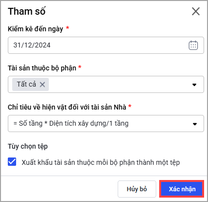 – Vào phần Tổng kiểm kê/Tài sản cố định/Quy trình. Nhấn chọn Xuất khẩu danh sách tài sản
