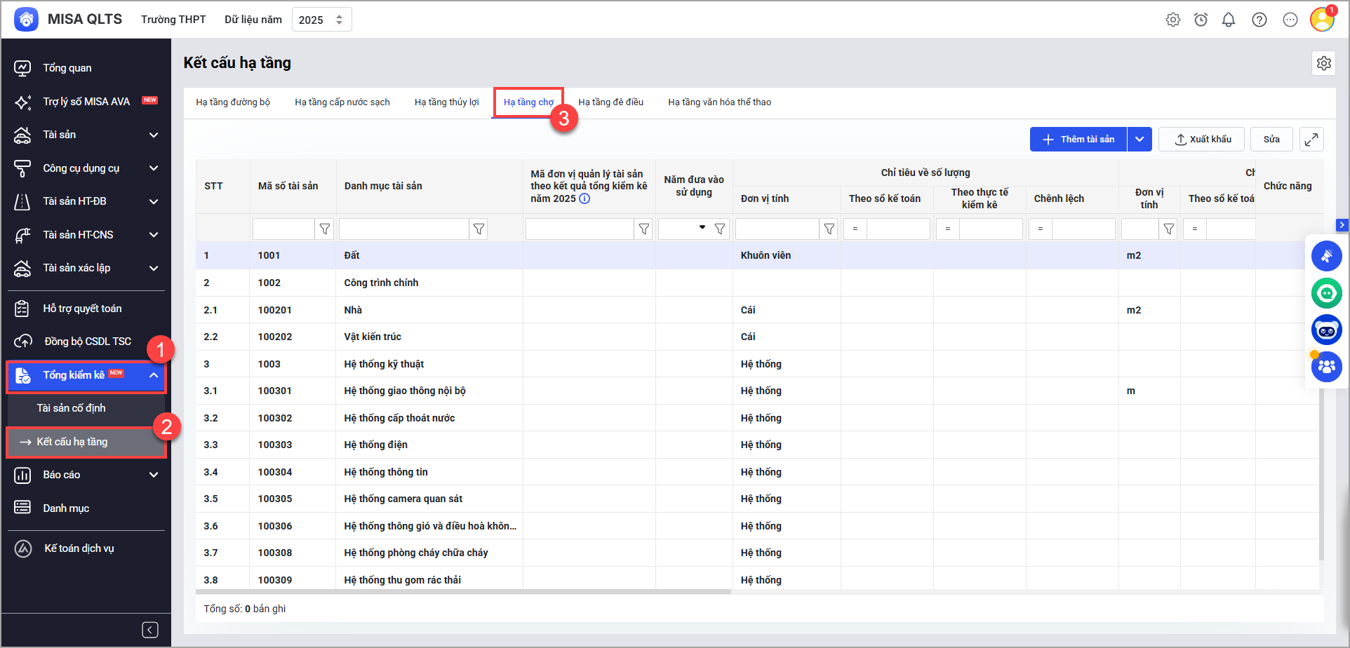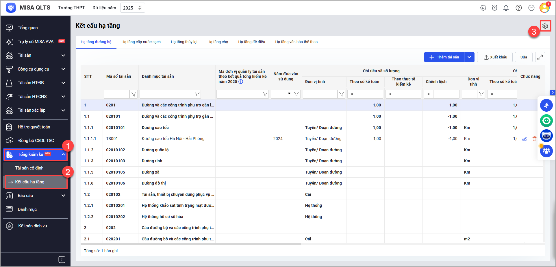• Vào menu Tổng kiểm kê/Kết cấu hạ tầng. Bấm vào biểu tượng cài đặt hình bánh răng