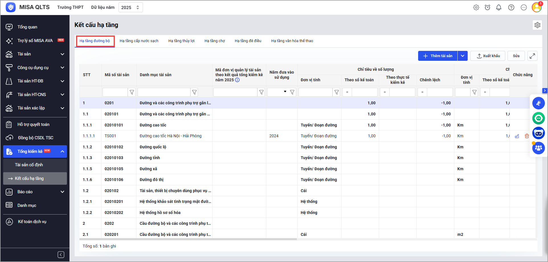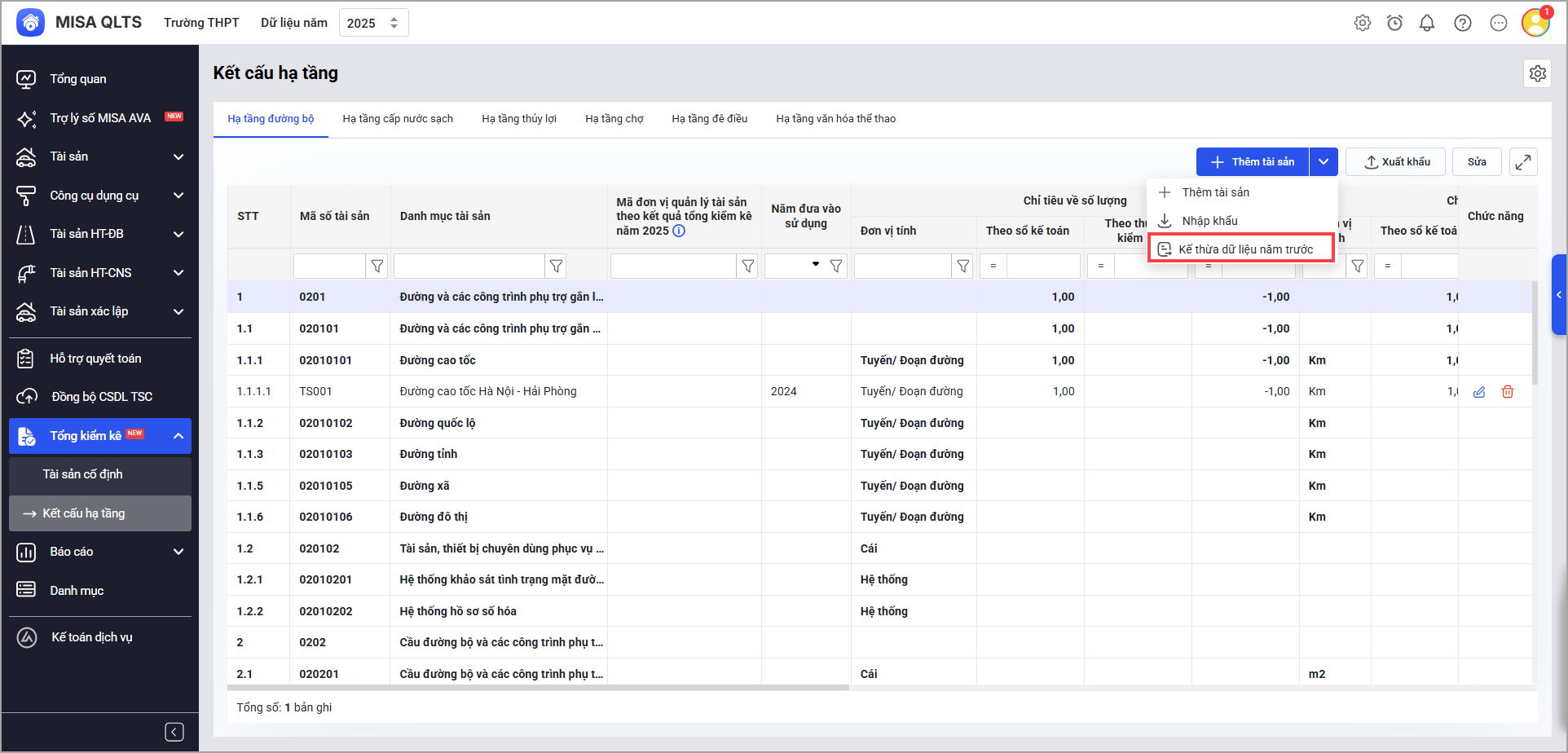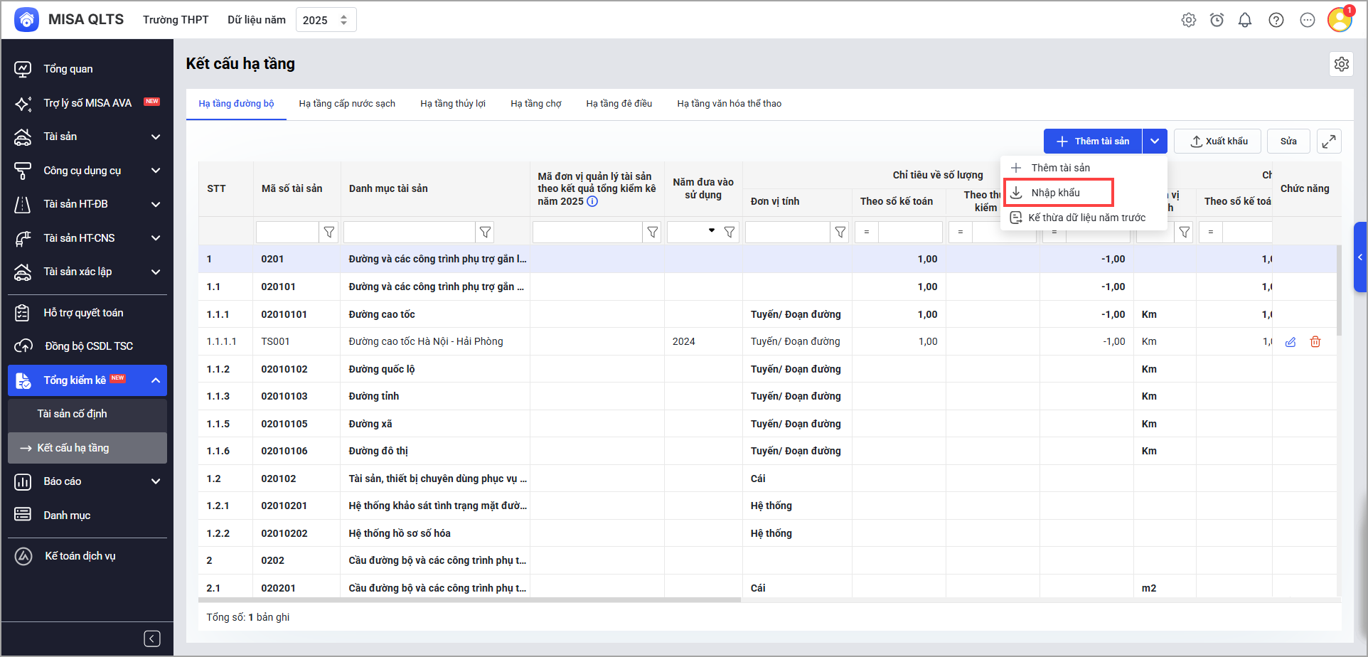 1. Vào Tổng kiểm kê/Kết cấu hạ tầng chọn mục Hạ tầng đường bộ