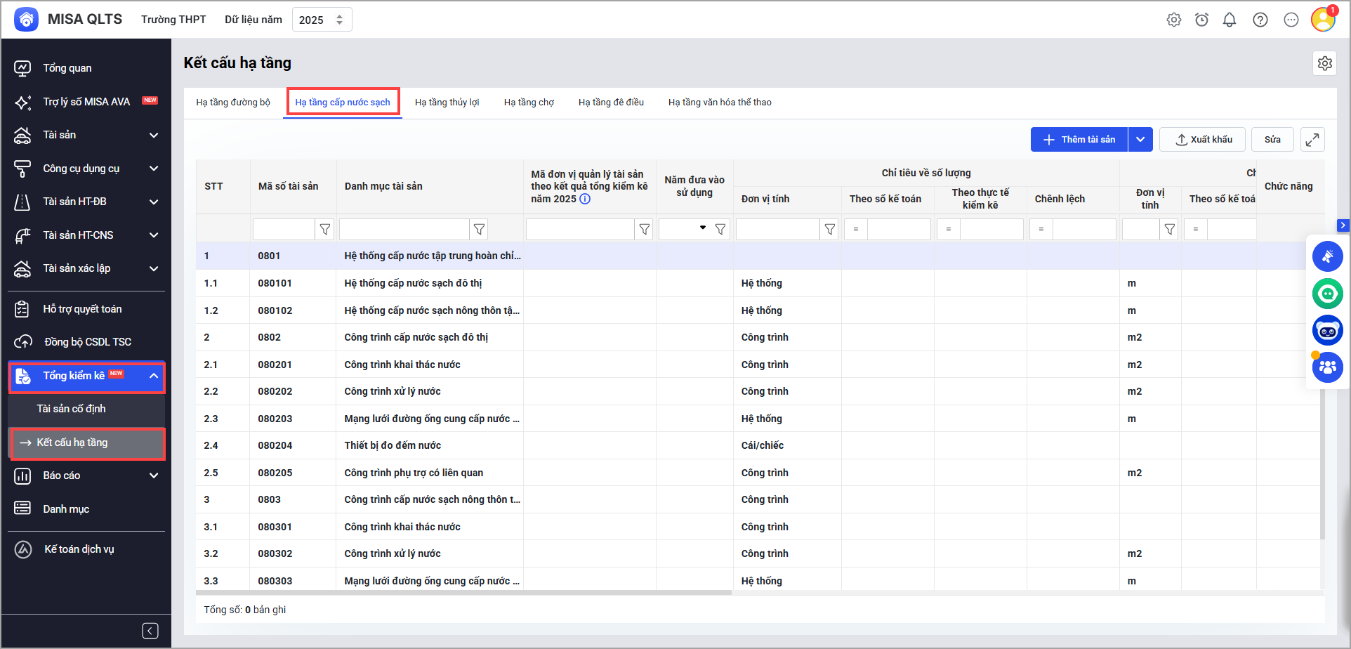 1. Vào Tổng kiểm kê/Kết cấu hạ tầng chọn mục Hạ tầng cấp nước sạch