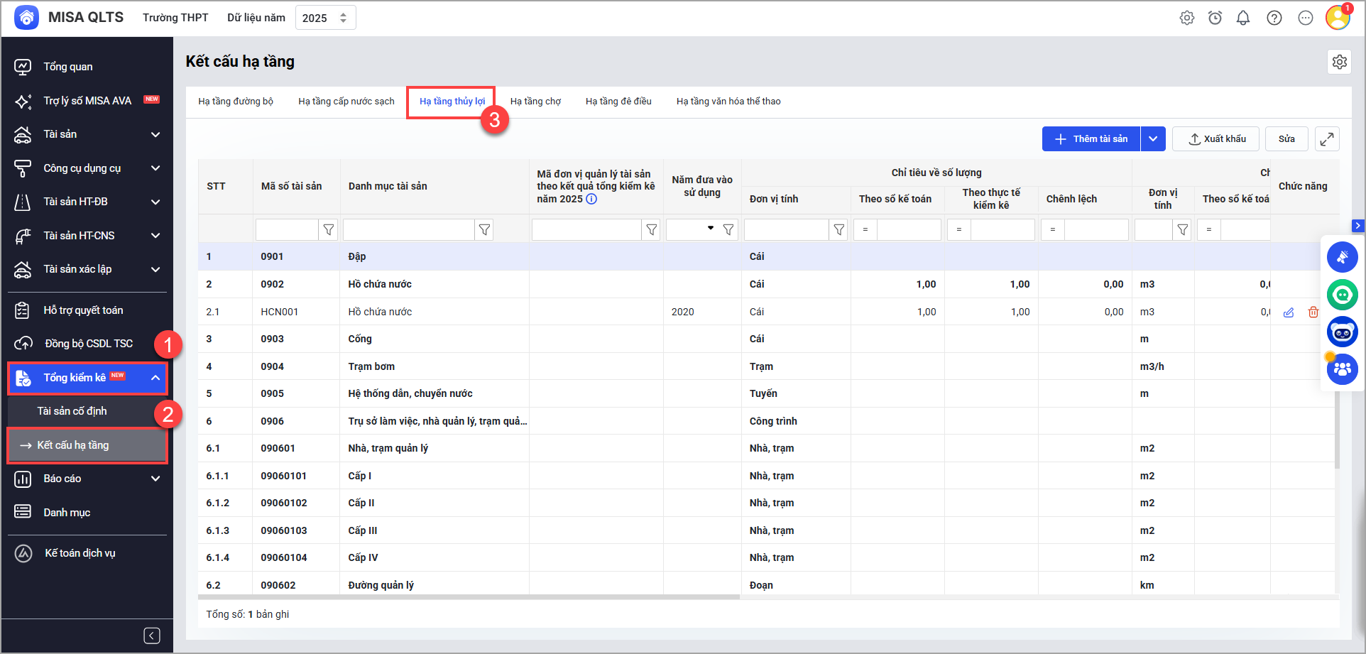 1. Vào Tổng kiểm kê/Kết cấu hạ tầng chọn mục Hạ tầng thủy lợi
