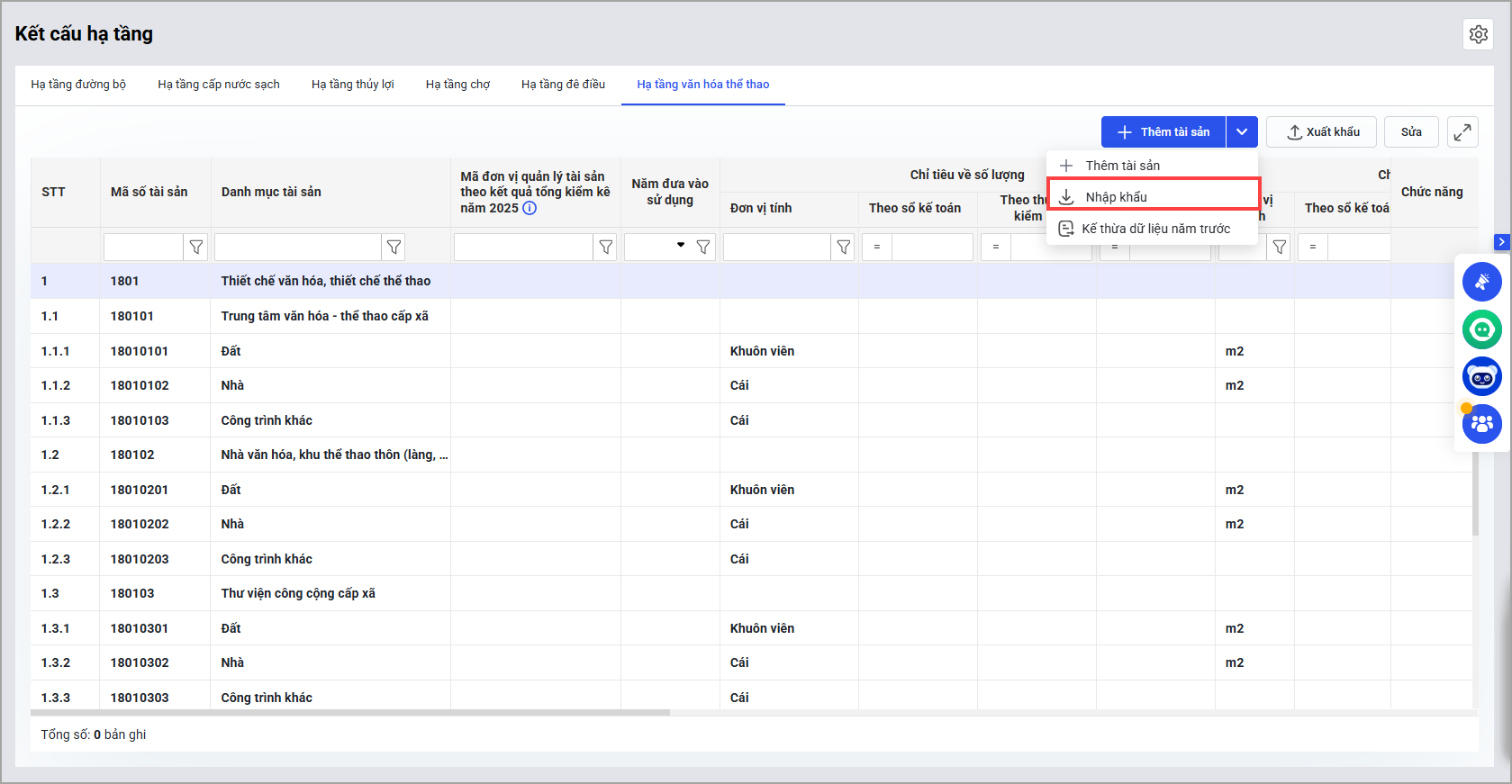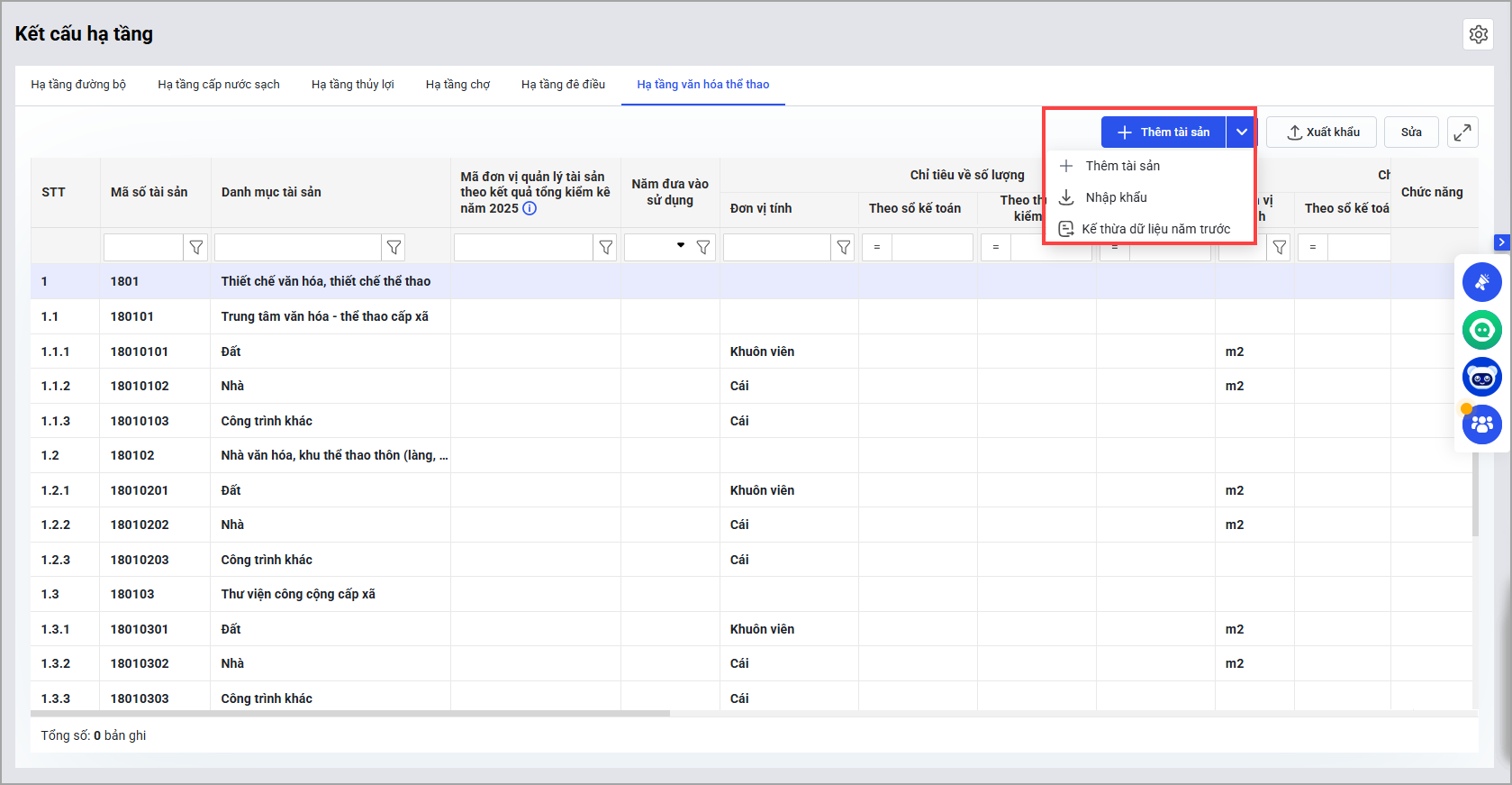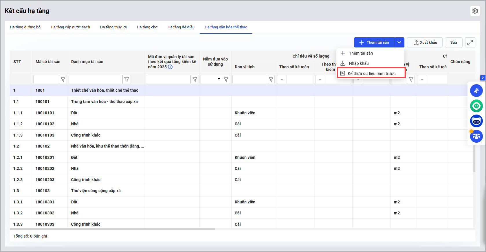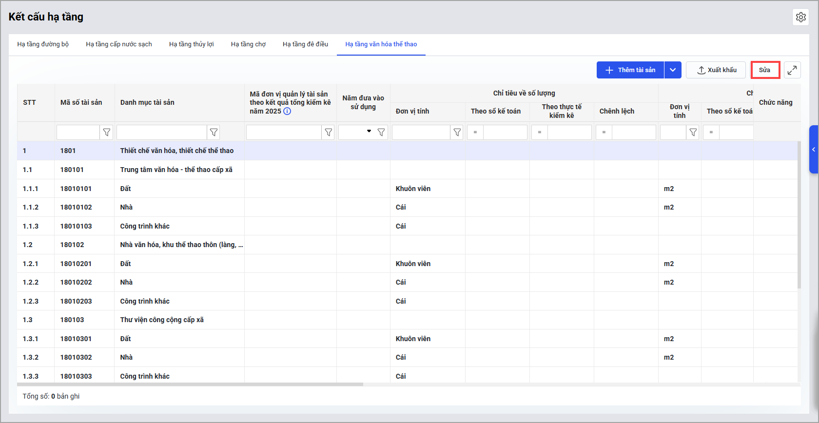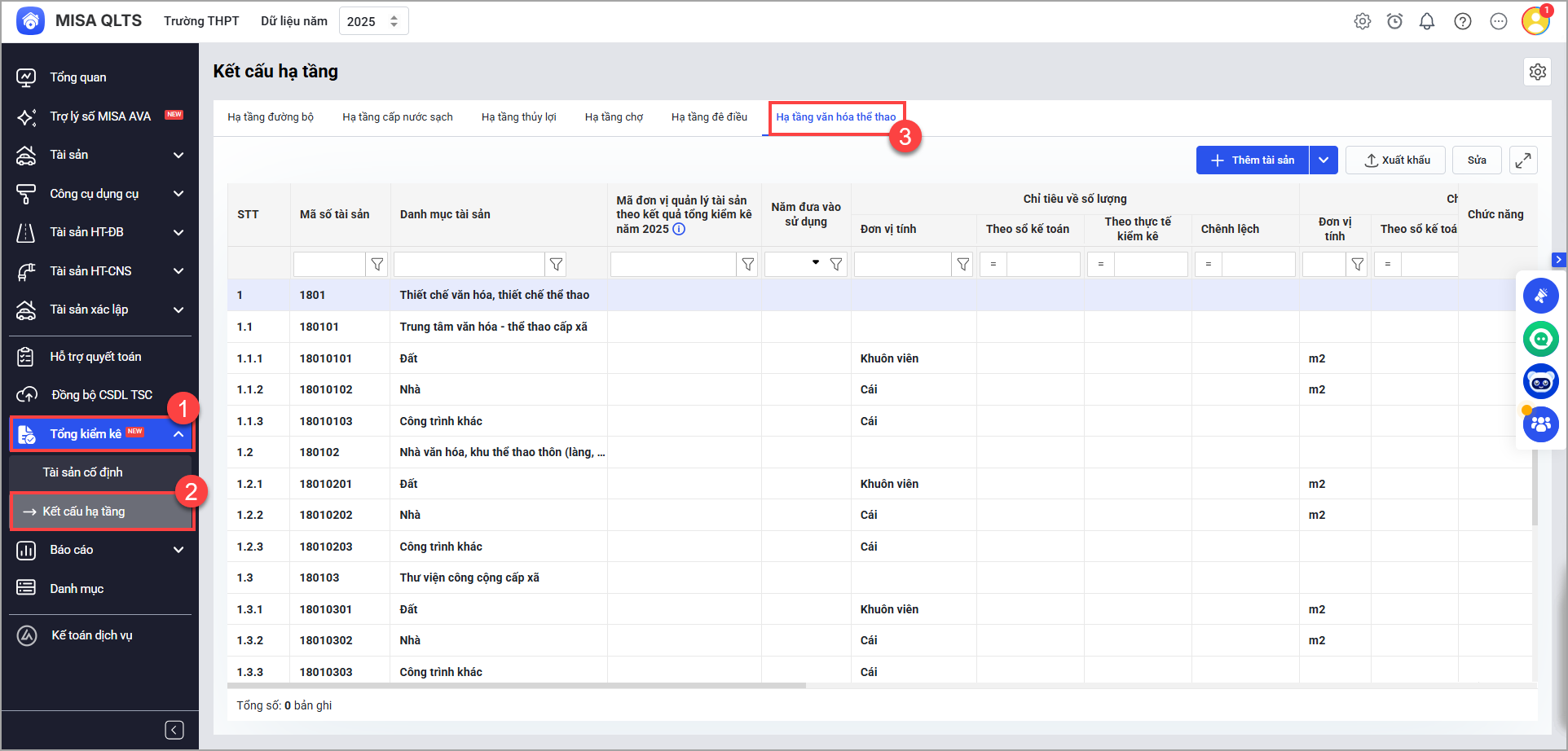 1. Vào Tổng kiểm kê/Kết cấu hạ tầng chọn mục Hạ tầng văn hóa – thể thao