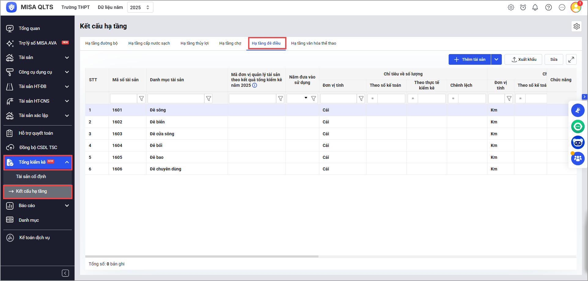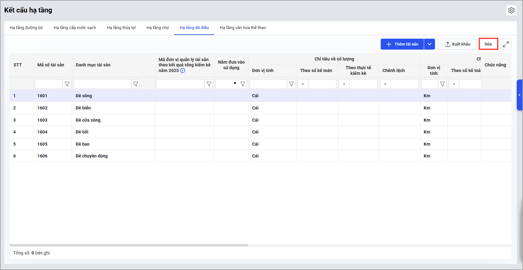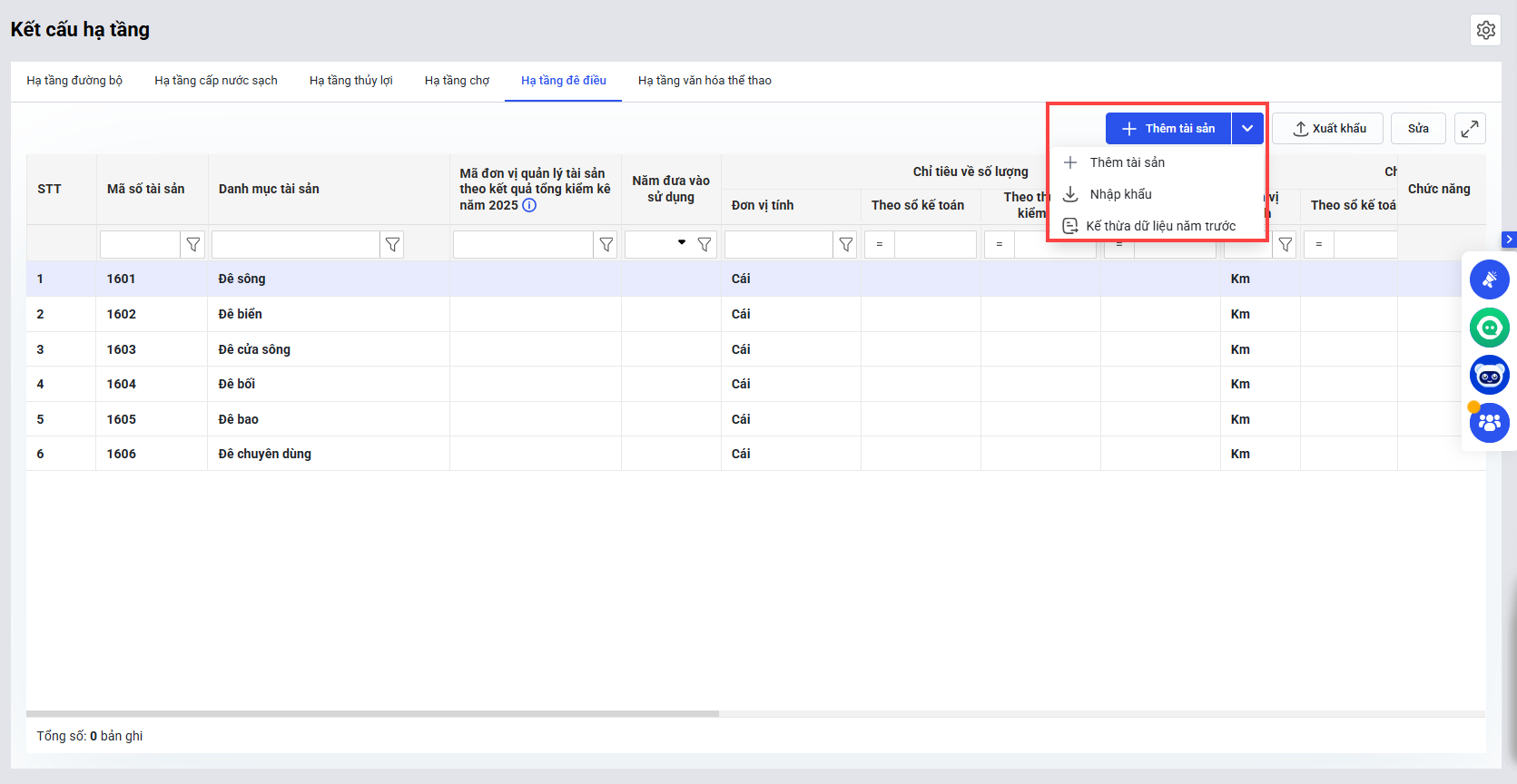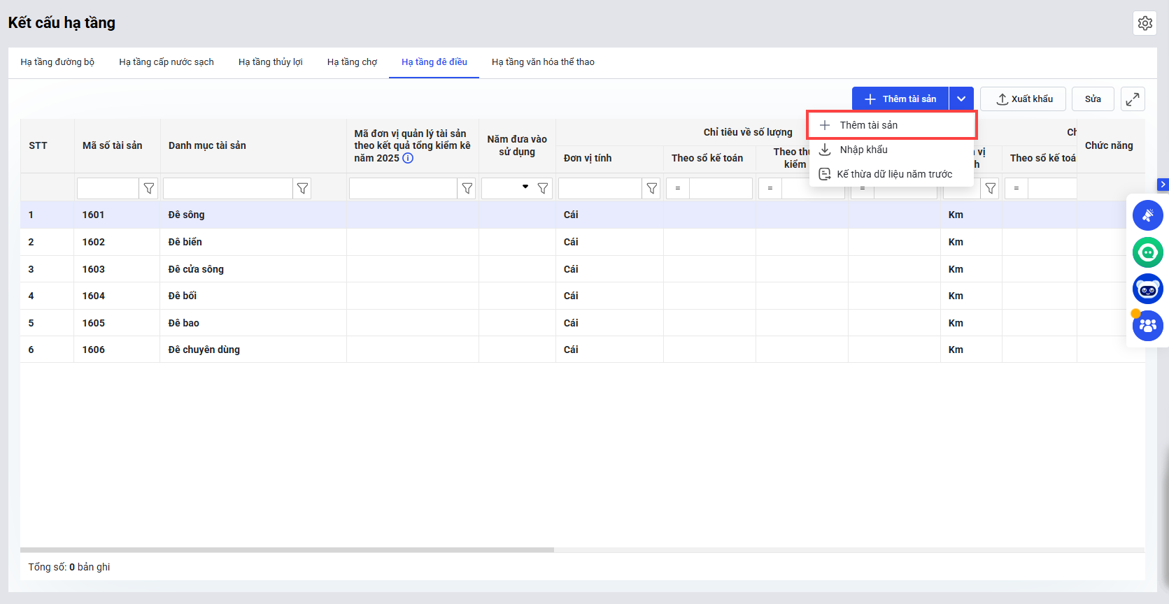 1. Vào Tổng kiểm kê/Kết cấu hạ tầng chọn mục Hạ tầng đê điều