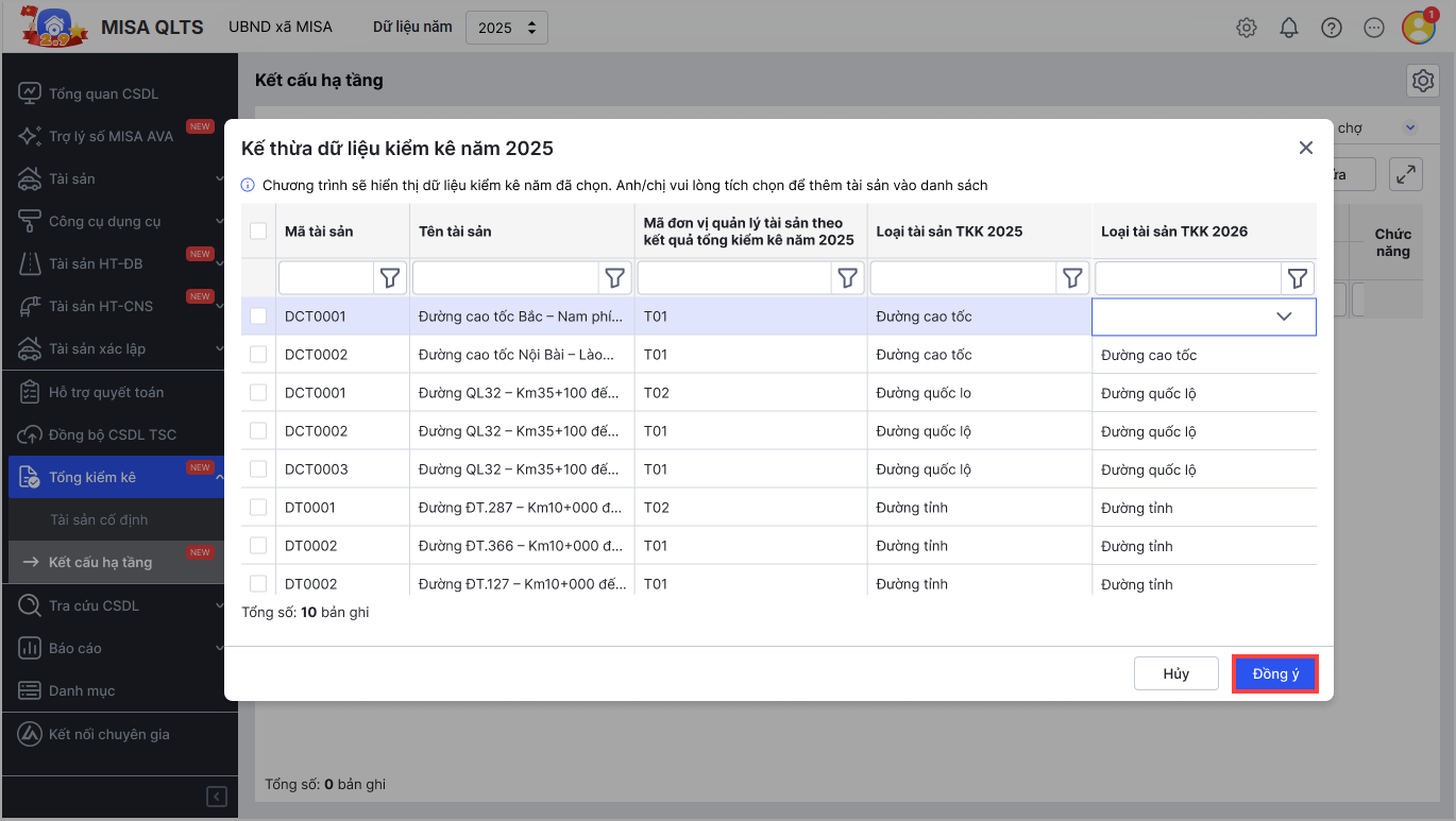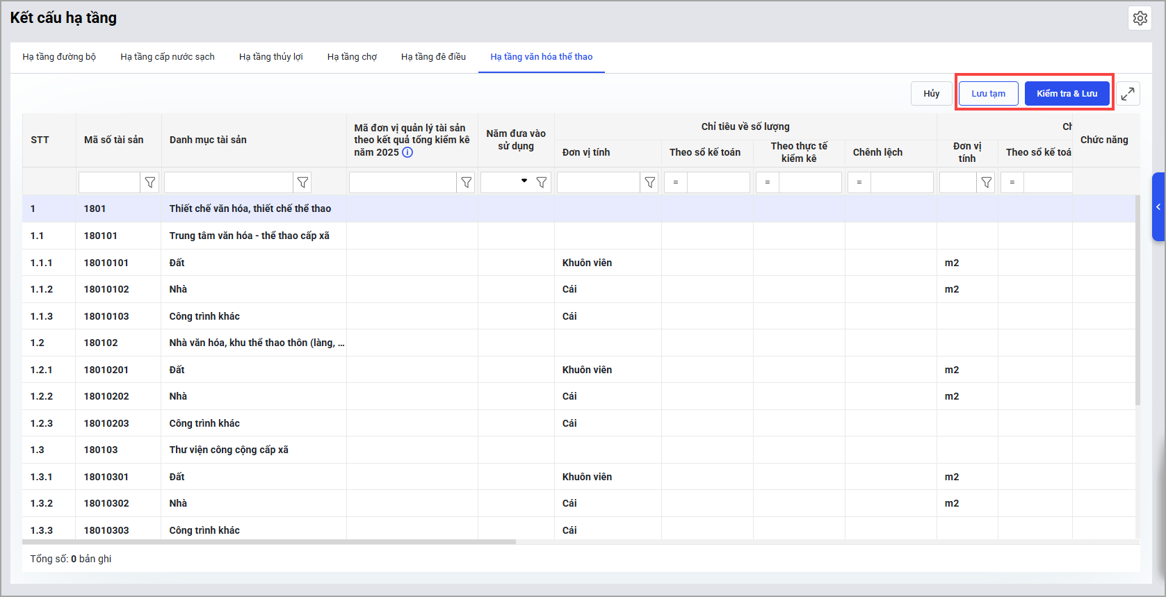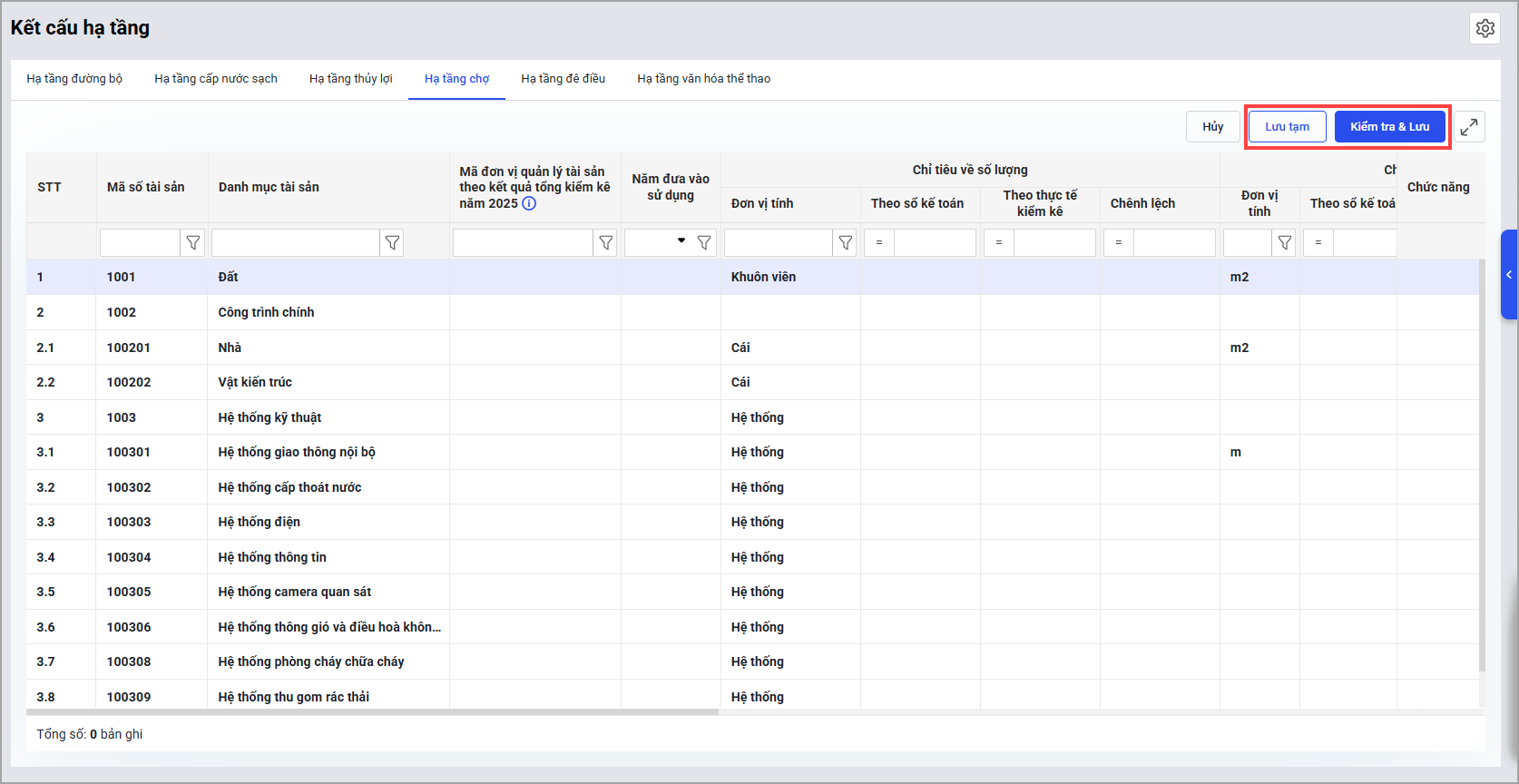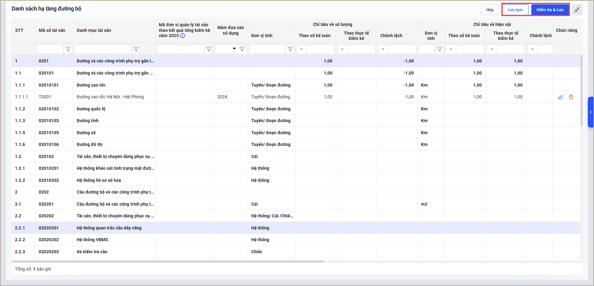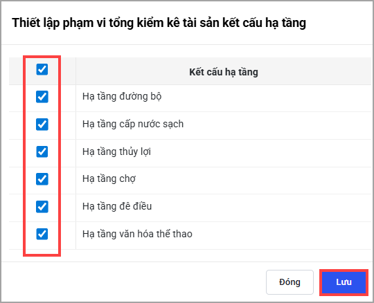 • Tích chọn 1 hoặc nhiều tài sản kết cấu hạ tầng cần kiểm kê, sau đó nhấn Lưu