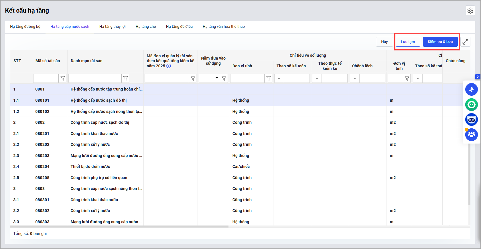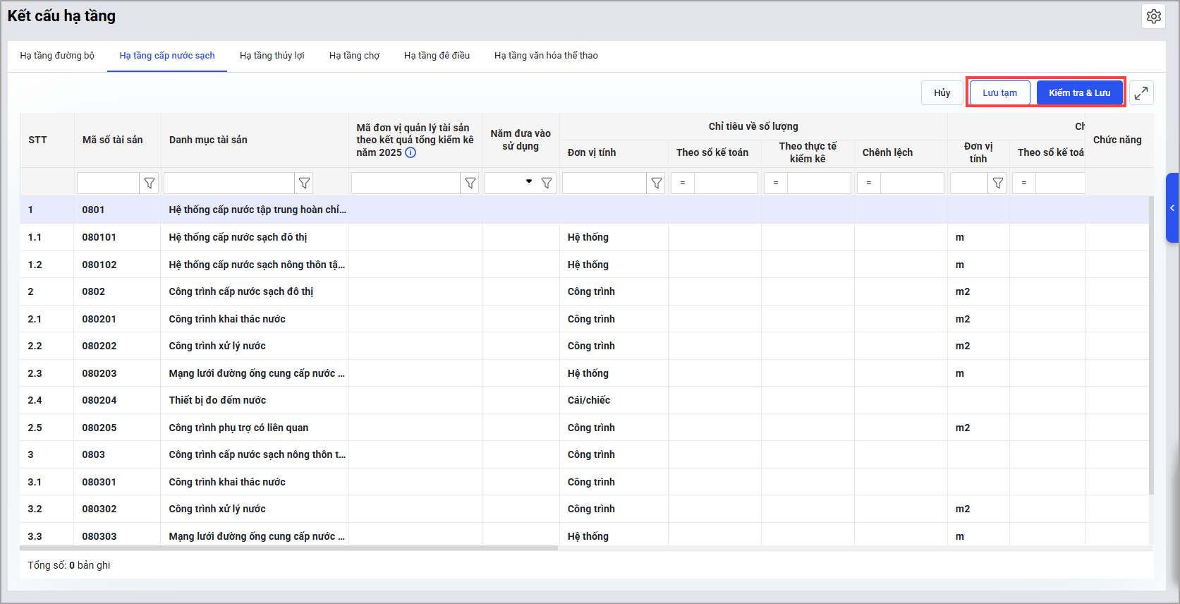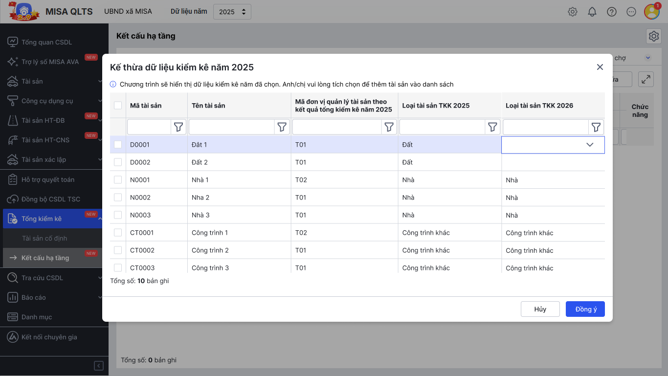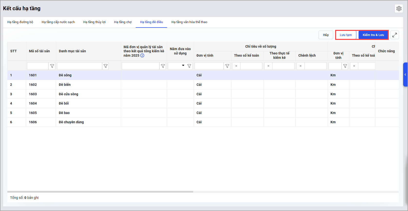 • Tích chọn 1 hoặc nhiều tài sản kết cấu hạ tầng cần kiểm kê, sau đó nhấn Lưu