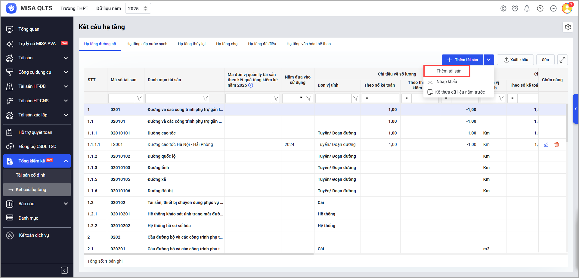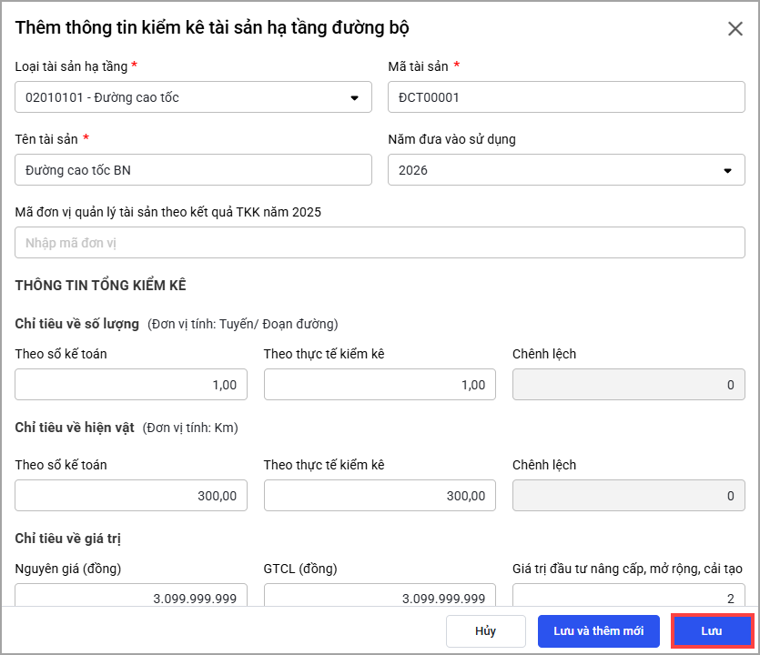 • Tại màn hình thêm thông tin kiểm kê tài sản đường bộ, anh/chị nhập đủ các thông tin sau: Loại tài sản hạ tầng, mã tài sản, tên tài sản, năm đưa vào sử dụng, thông tin kiểm kê (chỉ tiêu về số lượng, chỉ tiêu về giá trị)
