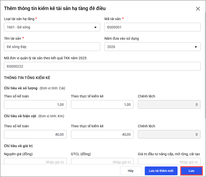 • Tại màn hình thêm thông tin kiểm kê tài sản hạ tầng đê điều, anh/chị nhập đủ các thông tin sau: Loại tài sản hạ tầng, mã tài sản, tên tài sản, năm đưa vào sử dụng, thông tin kiểm kê (chỉ tiêu về số lượng, chỉ tiêu về giá trị)