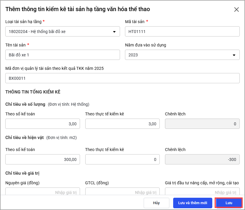 • Tại màn hình thêm thông tin kiểm kê tài sản hạ tầng văn hóa thể thao, anh/chị nhập đủ các thông tin sau: Loại tài sản hạ tầng, mã tài sản, tên tài sản, năm đưa vào sử dụng, thông tin kiểm kê (chỉ tiêu về số lượng, chỉ tiêu về giá trị)