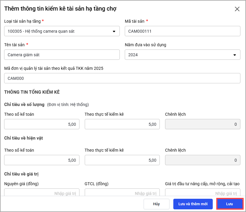• Tại màn hình thêm thông tin kiểm kê tài sản hạ tầng chợ, anh/chị nhập đủ các thông tin sau: Loại tài sản hạ tầng, mã tài sản, tên tài sản, năm đưa vào sử dụng, thông tin kiểm kê (chỉ tiêu về số lượng, chỉ tiêu về giá trị)