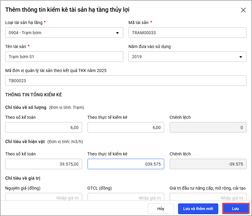 • Tại màn hình thêm thông tin kiểm kê tài sản hạ tầng thủy lợi, anh/chị nhập đủ các thông tin sau: Loại tài sản hạ tầng, mã tài sản, tên tài sản, năm đưa vào sử dụng, thông tin kiểm kê (chỉ tiêu về số lượng, chỉ tiêu về giá trị)