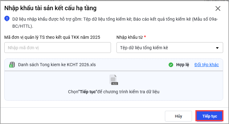 Lưu ý:  Dữ liệu nhập khẩu được hỗ trợ gồm: Tệp dữ liệu tổng kiểm kê; Báo cáo kết quả tổng kiểm kê (Mẫu số 09a-BC/HTTL)