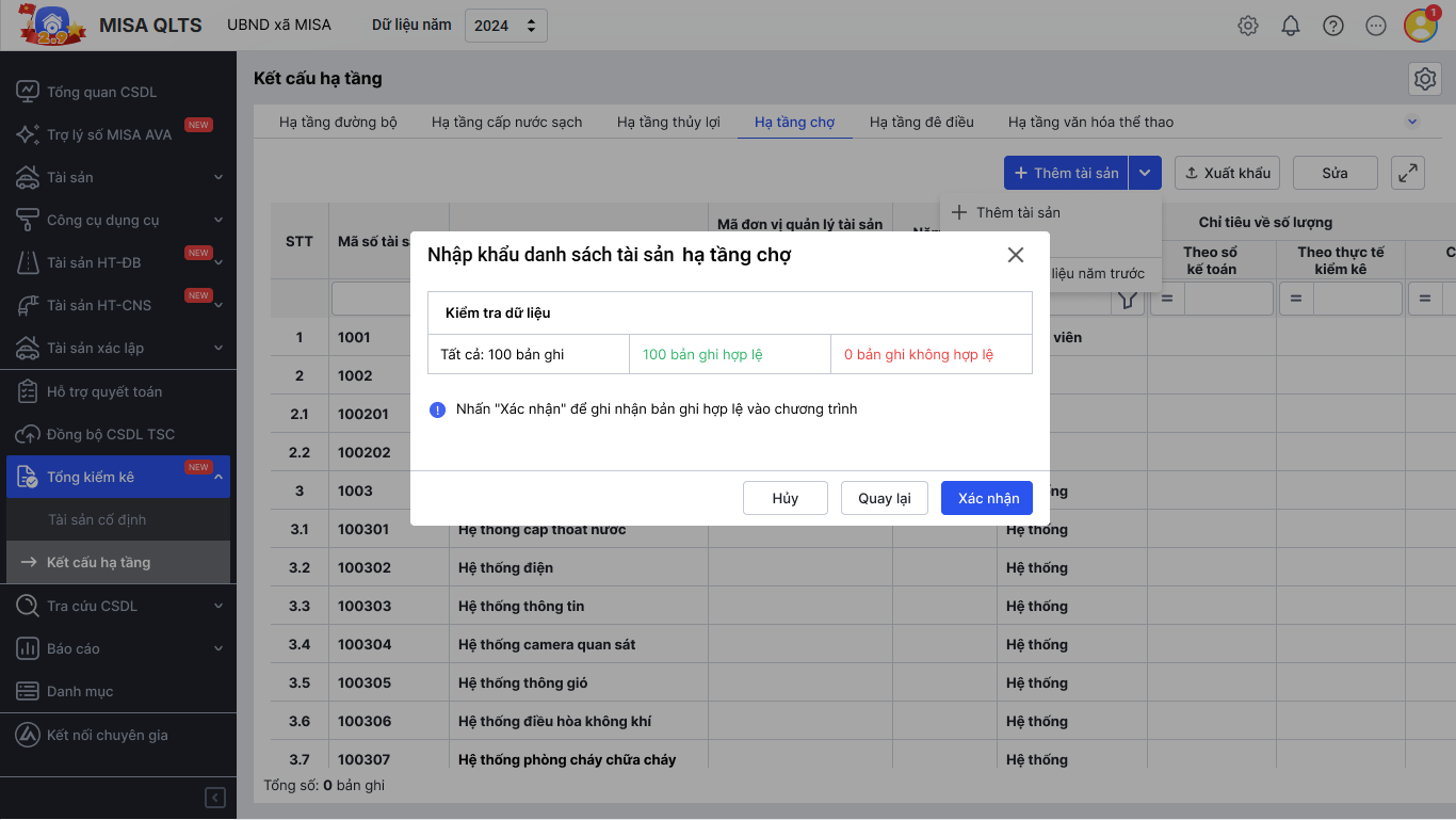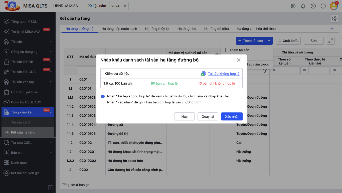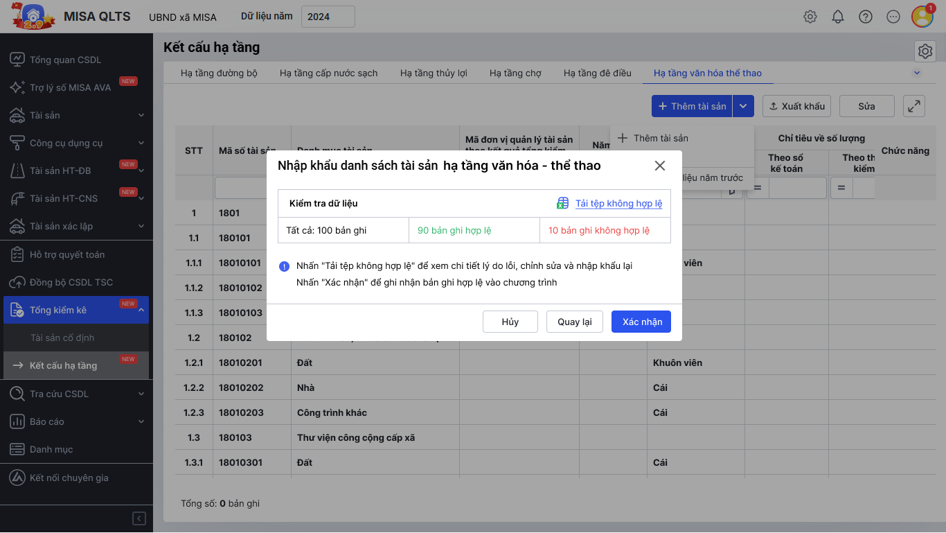 • Màn hình thông báo kết quả kiểm tra dữ liệu bao gồm các bản ghi hợp lệ và không hợp lệ. Nhấn Xác nhận  để hoàn tất quá trình thêm tài sản.