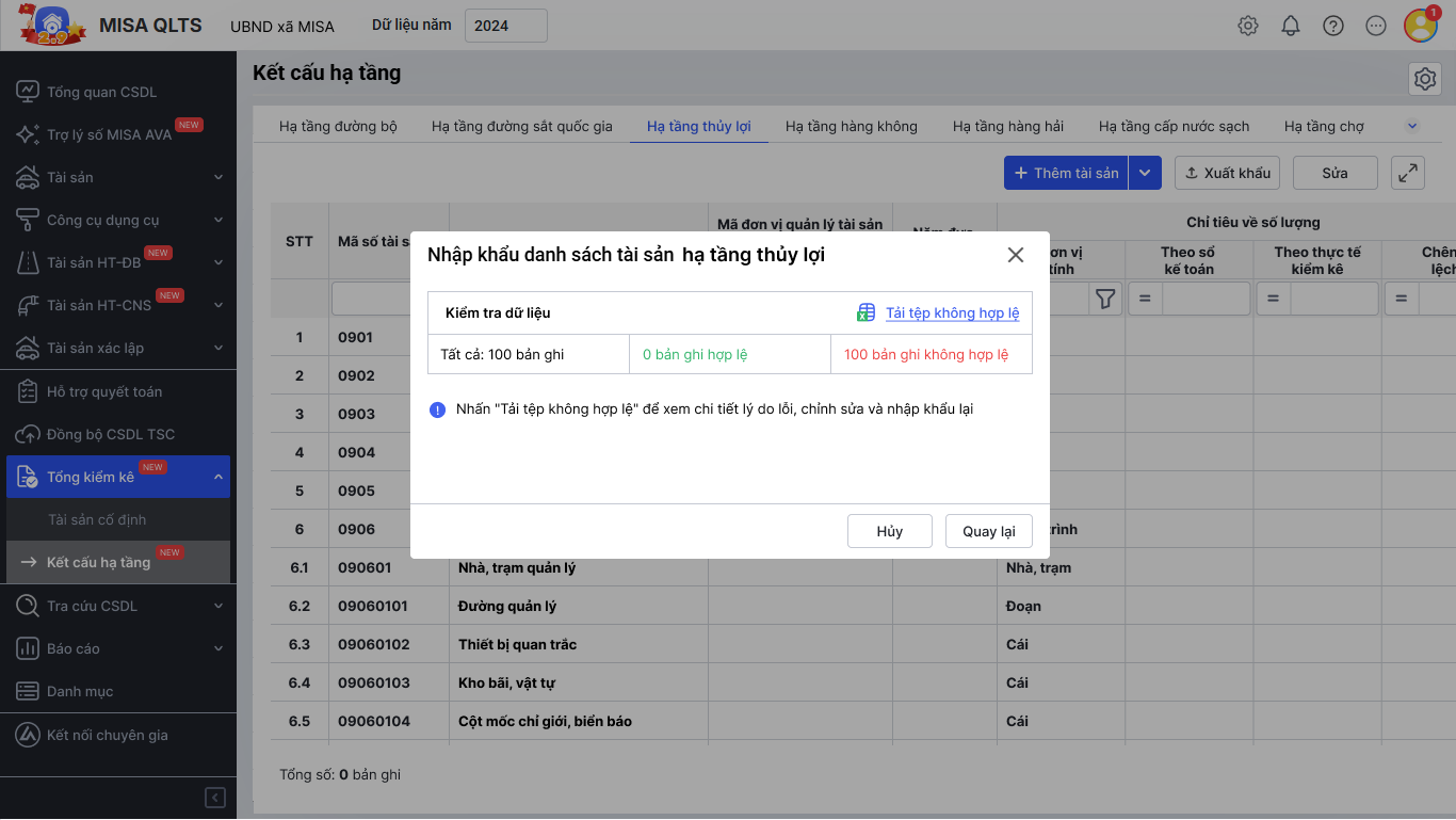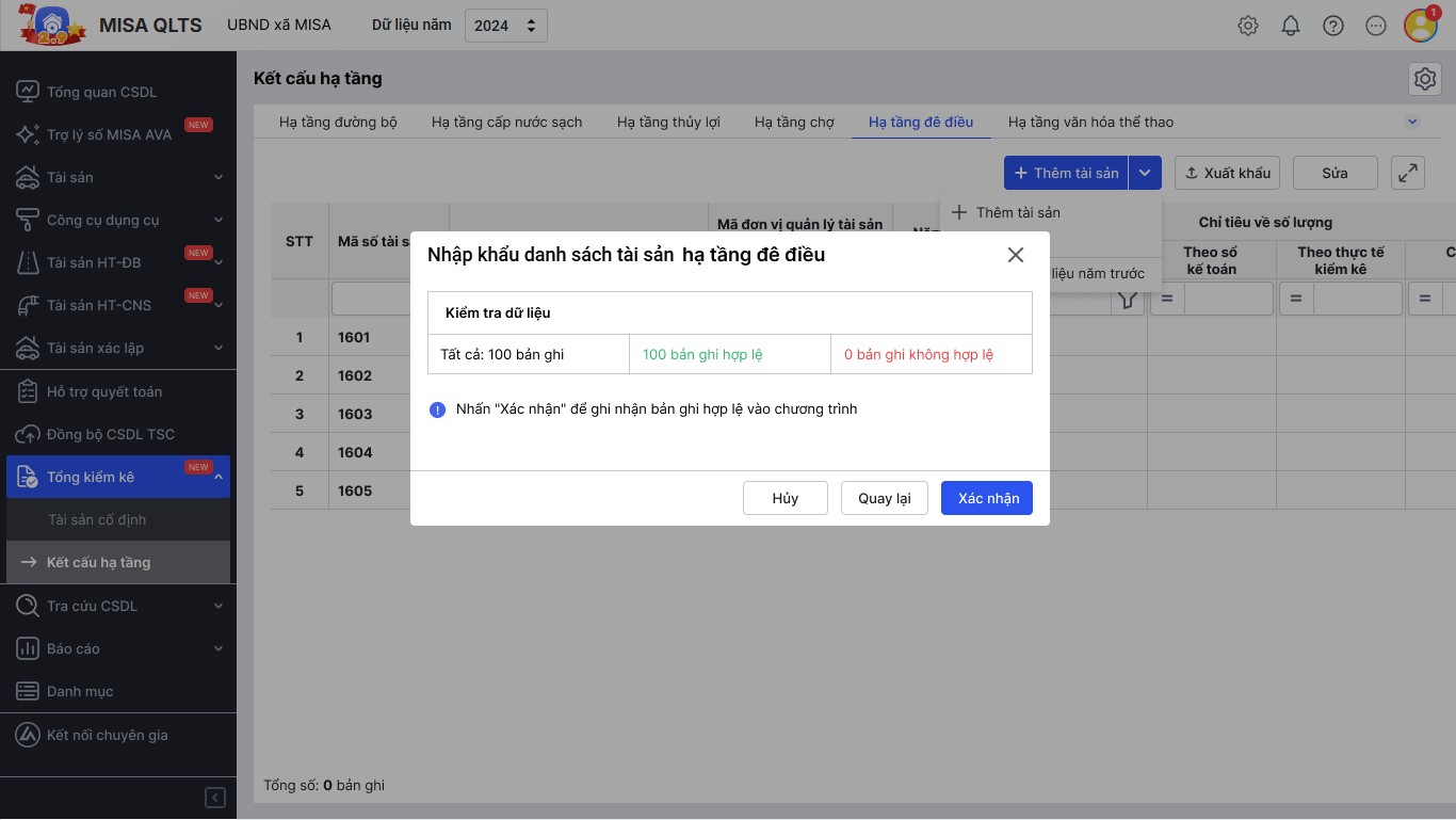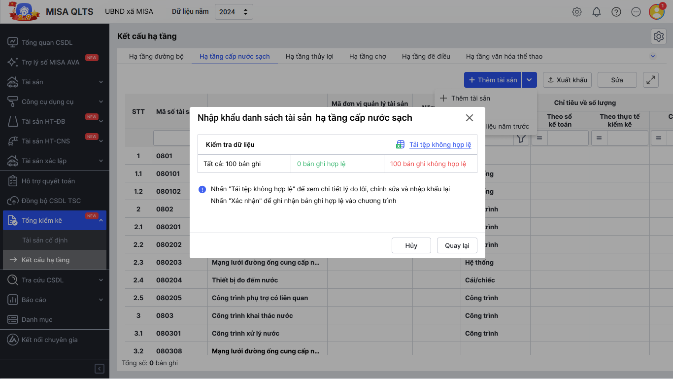 • Màn hình thông báo kết quả kiểm tra dữ liệu bao gồm các bản ghi hợp lệ và không hợp lệ. Nhấn Xác nhận  để hoàn tất quá trình thêm tài sản.