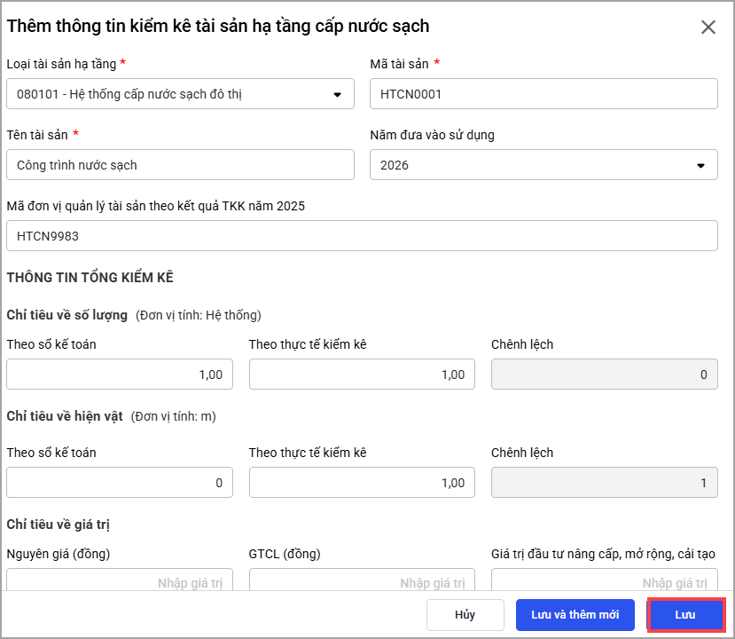 • Tại màn hình thêm thông tin kiểm kê tài sản hạ tầng cấp nước sạch, anh/chị nhập đủ các thông tin sau: Loại tài sản hạ tầng, mã tài sản, tên tài sản, năm đưa vào sử dụng, thông tin kiểm kê (chỉ tiêu về số lượng, chỉ tiêu về giá trị)