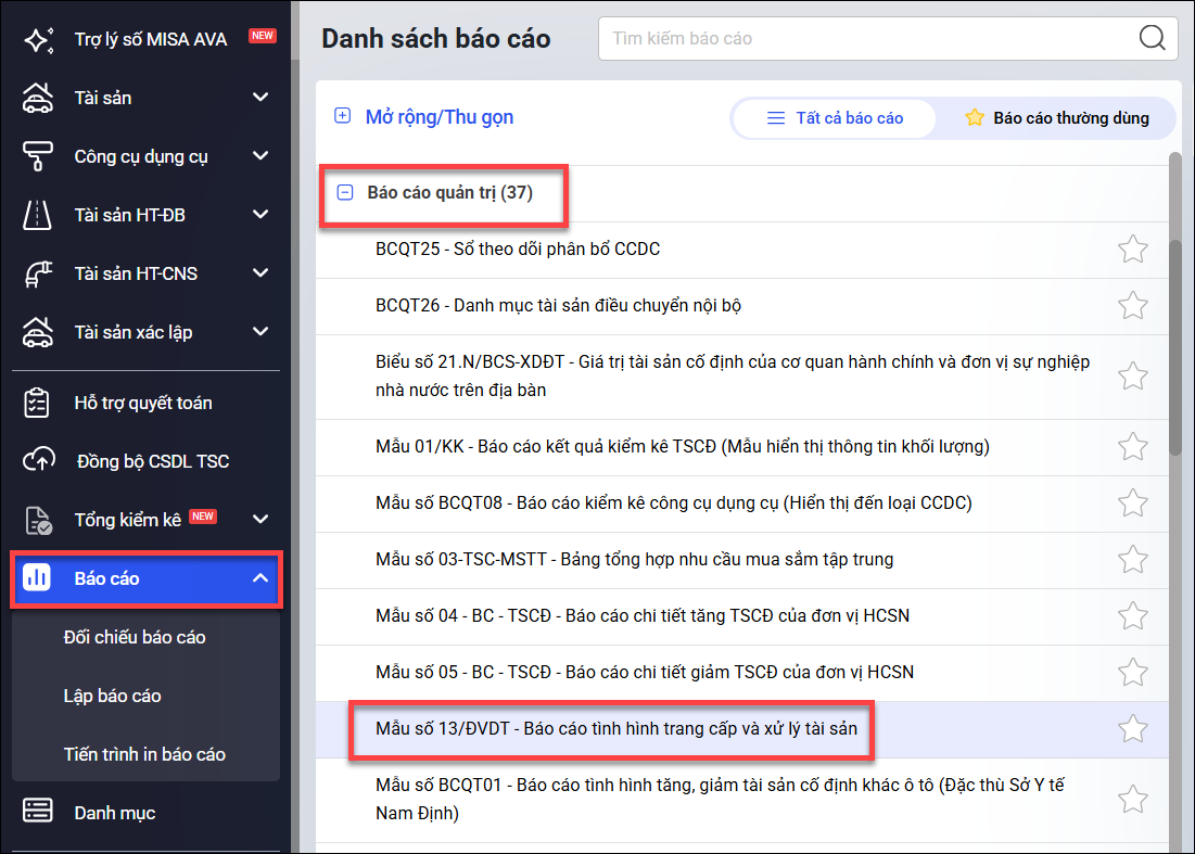 Bước 1: Vào menu Báo cáo\Báo cáo quản trị\chọn Mẫu số 13/ĐVDT: Báo cáo tình trạng cấp và xử lý tài sản.