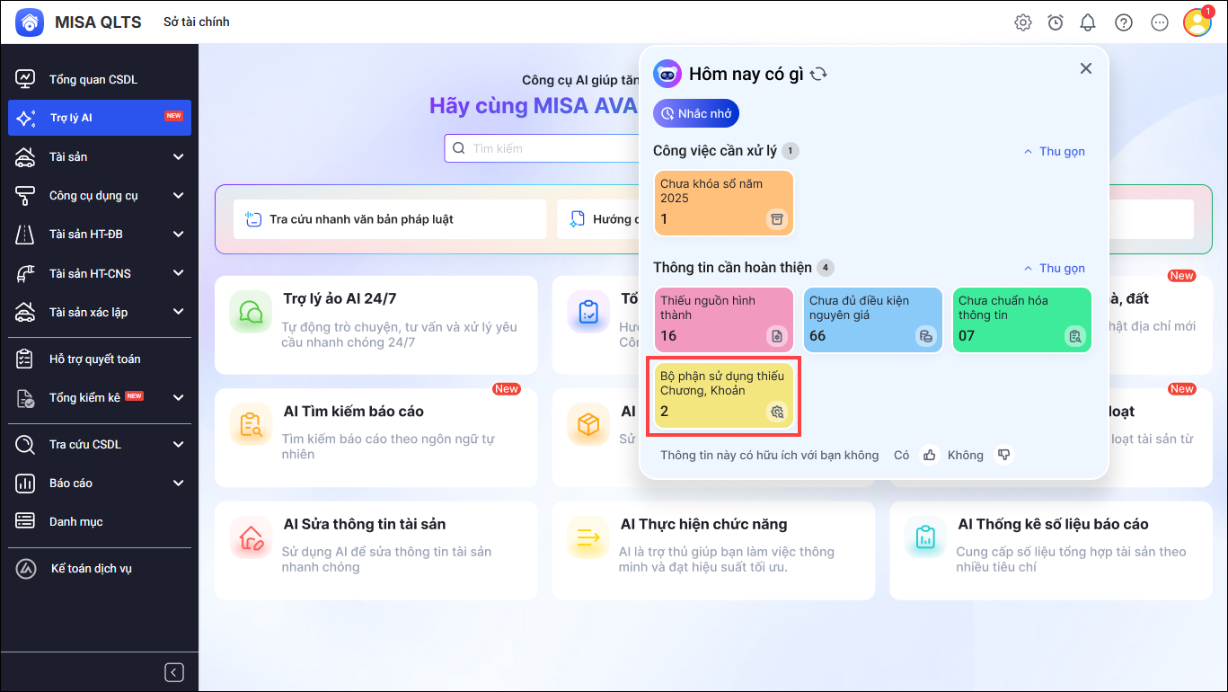 - Khi truy cập vào phần mềm MISA QLTS, trợ lý số MISA AVA hiển thị nhắc nhở về Công việc cần xử lý và Thông tin cần hoàn thiện.