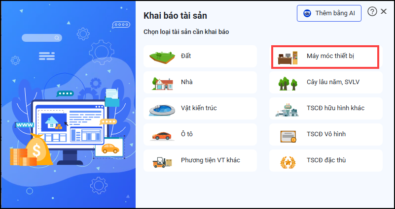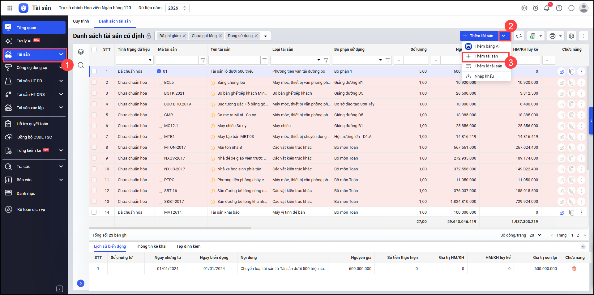 - Vào Tài sản. Nhấn dấu mũi tên tại nút Thêm tài sản, chọn Thêm tài sản