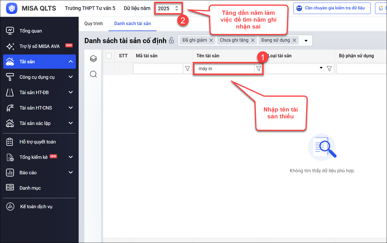 • Bước 2: Nhập tên tài sản để tìm kiếm, sau đó lần lượt thay đổi năm làm việc (Dữ liệu năm) để xác định năm đã khai báo nhầm.