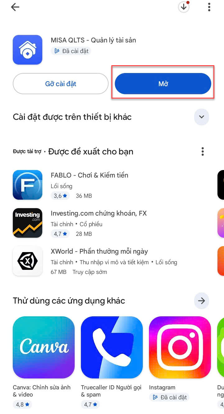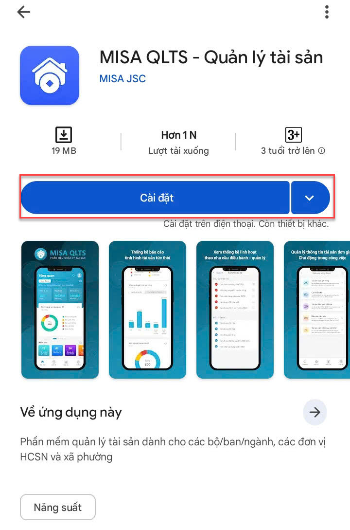 Bước 1. Vào chợ ứng dụng CH Play, nhập MISA QLTS trên thanh tìm kiếm. Chọn ứng dụng MISA QLTS – Quản lý tài sản \ ChọnCài đặt.