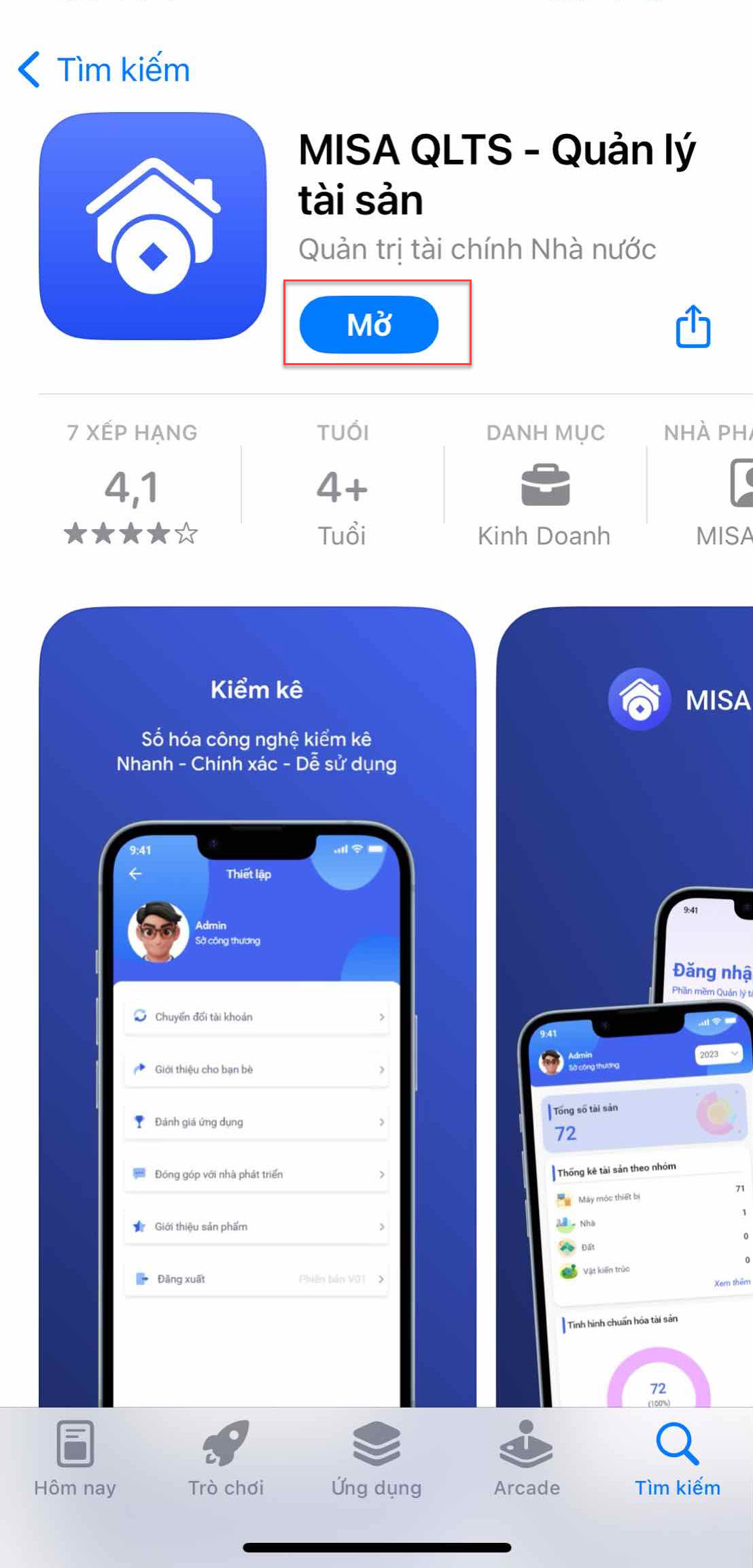 Bước 1. Vào chợ ứng dụng App Store trên điện thoại, nhập MISA QLTS trên thanh tìm kiếm. Tại ứng dụng MISA QLTS – Quản lý tài sản, nhấn Nhận để tải ứng dụng về điện thoại