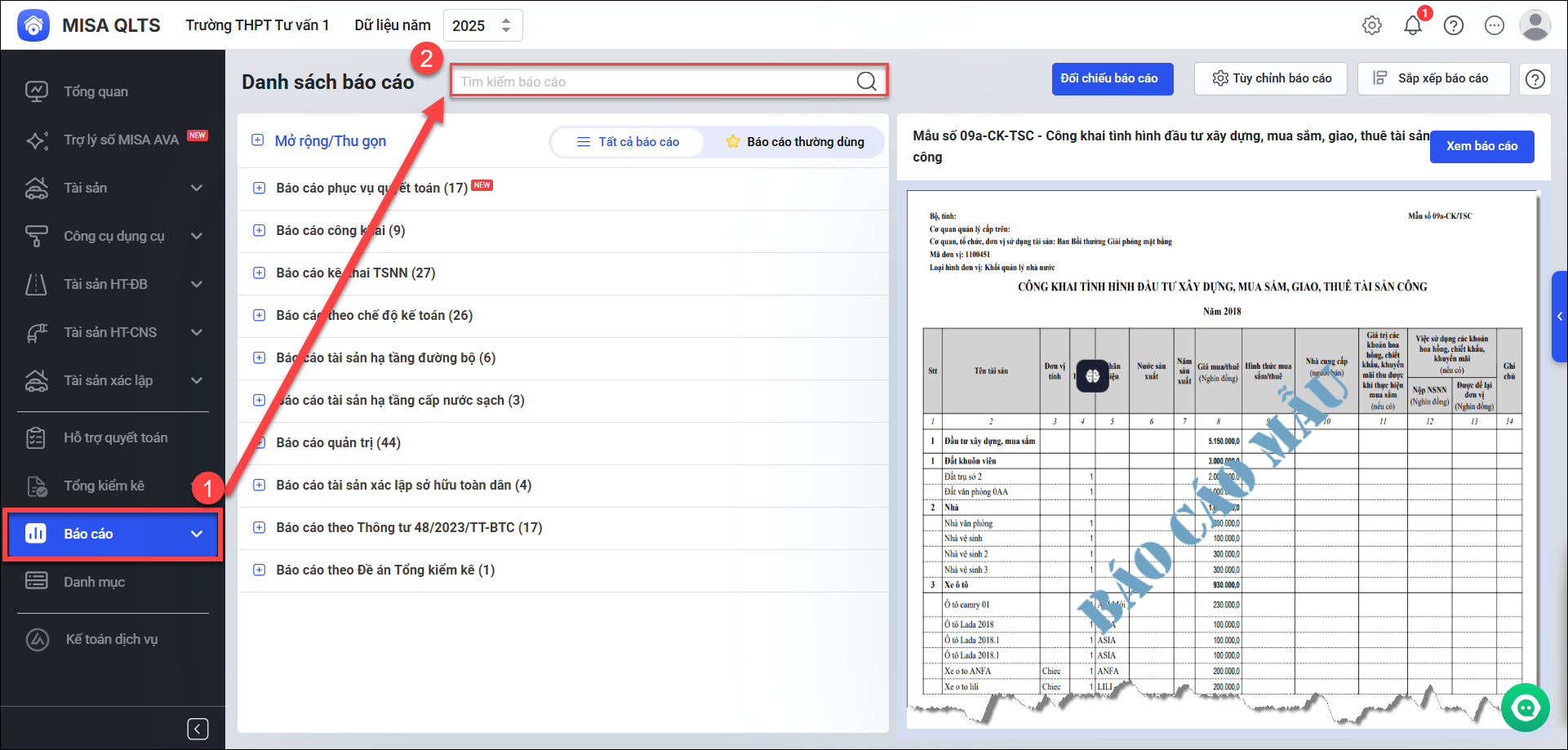 Bước 2: Tại ô Tìm kiếm báo cáo, anh/chị nhập tên báo cáo muốn xem (ví dụ: “Chi tiết tài sản cố định”, “BCQT04”, “Tăng giảm tài sản”…).