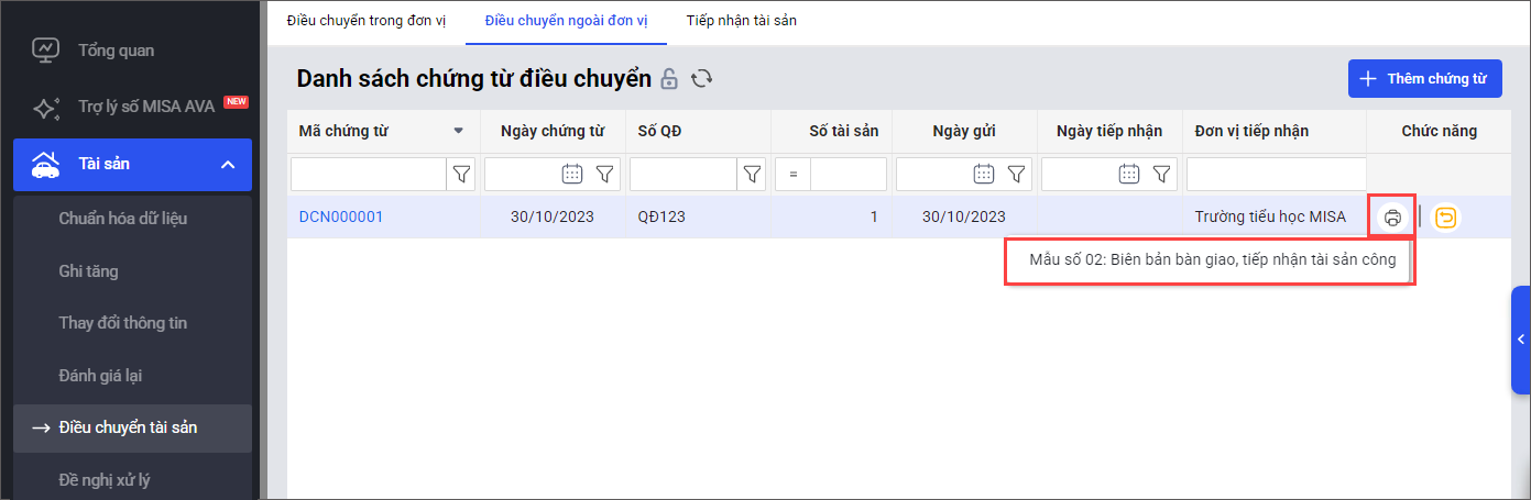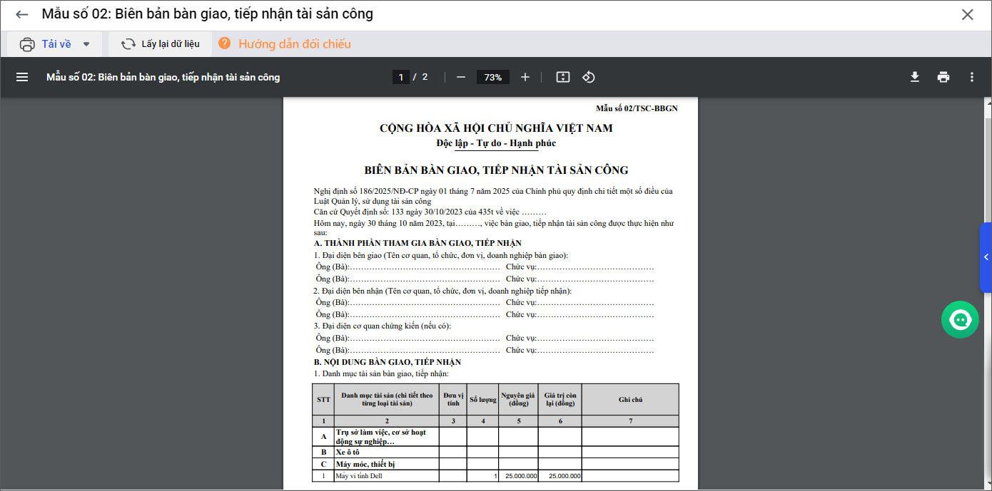 Bước 2: Tại chứng từ cần in, nhấn in Mẫu số 02: Biên bản bàn giao, tiếp nhận tài sản công.