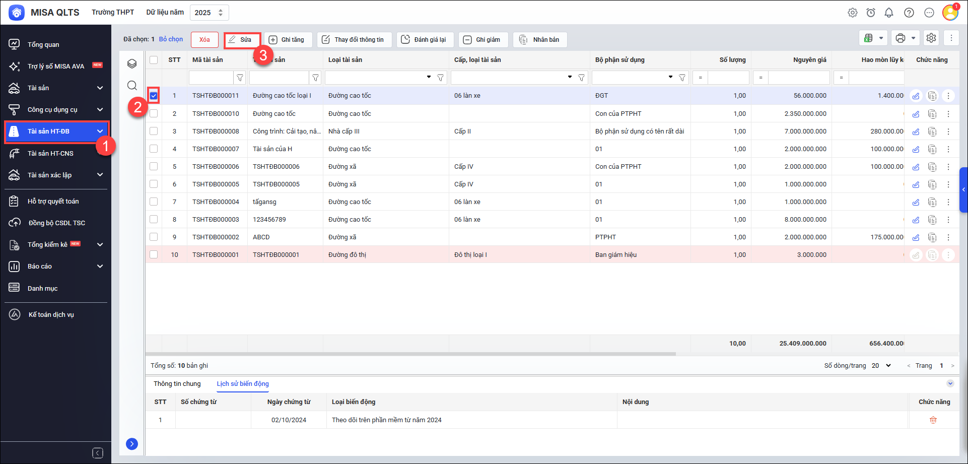 1. Vào Tài sản HT-ĐB, nhấn chọn mã tài sản sau đó chọn Sửa