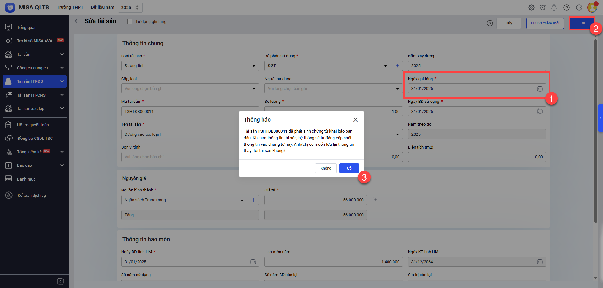 Khi theo dõi và quản lý tài sản hạ tầng đường bộ, cán bộ QLTS phát hiện có một số tài sản đã đưa vào sử dụng nhưng chưa quản lý trên phần mềm nên tiến hành khai báo bù bằng cách sửa trường Ngày ghi tăng nhỏ hơn năm theo dõi trên phần mềm.
