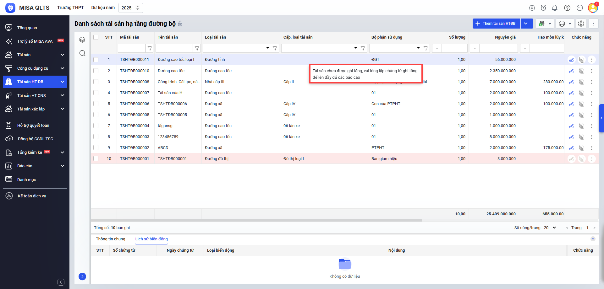 • Từ phiên bản R65: Nếu chưa phát sinh biến động sau khi khai báo bù, cán bộ QLTS có thể cập nhật lại thông tin tài sản hạ tầng đường bộ.