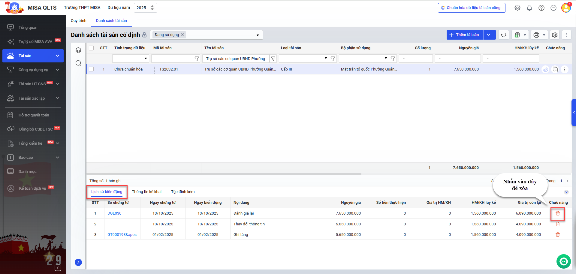 Bước 2. Tại tab Lịch sử biến động ở phía dưới, anh/chị nhấn vào biểu tượng thùng rác để xóa chứng từ liên quan.