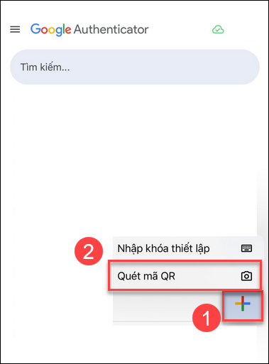 - Mở ứng dụng Google Authenticator trên điện thoại và bấm vào dấu + chọn Quét mã QR (mã QR hiện thị trên màn hình trang Tổng kiểm kê) để liên kết tài khoản và sinh mã xác thực.