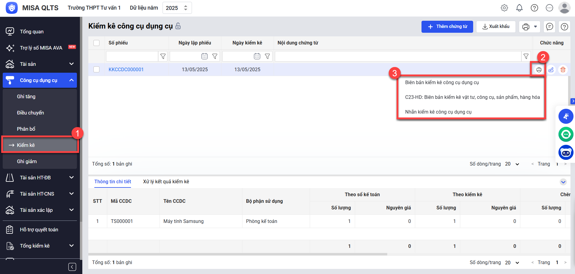 Bước 2: Tại Danh sách chứng từ kiểm kê, nhấn vào biểu tượng máy in, chọn Biên bản kiểm kê công cụ dụng cụ.