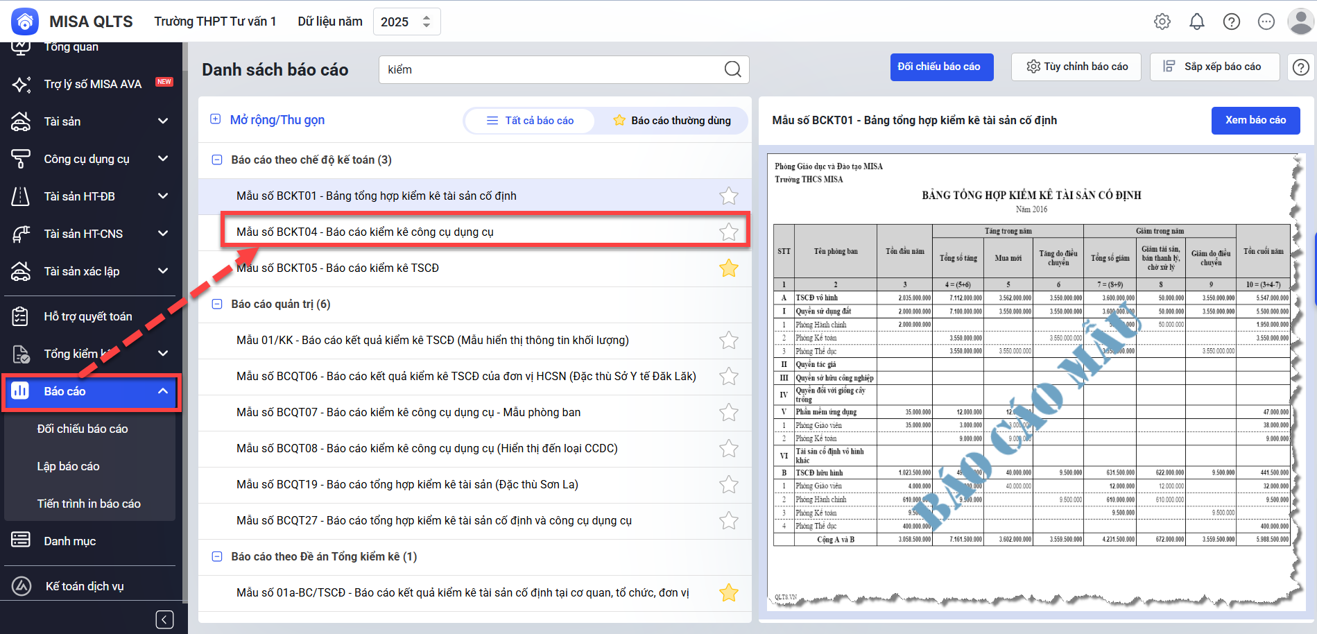 - Vào Báo cáo\Báo cáo theo chế độ kế toán\Mẫu số BCKT04 – Báo cáo kiểm kê công cụ dụng cụ.