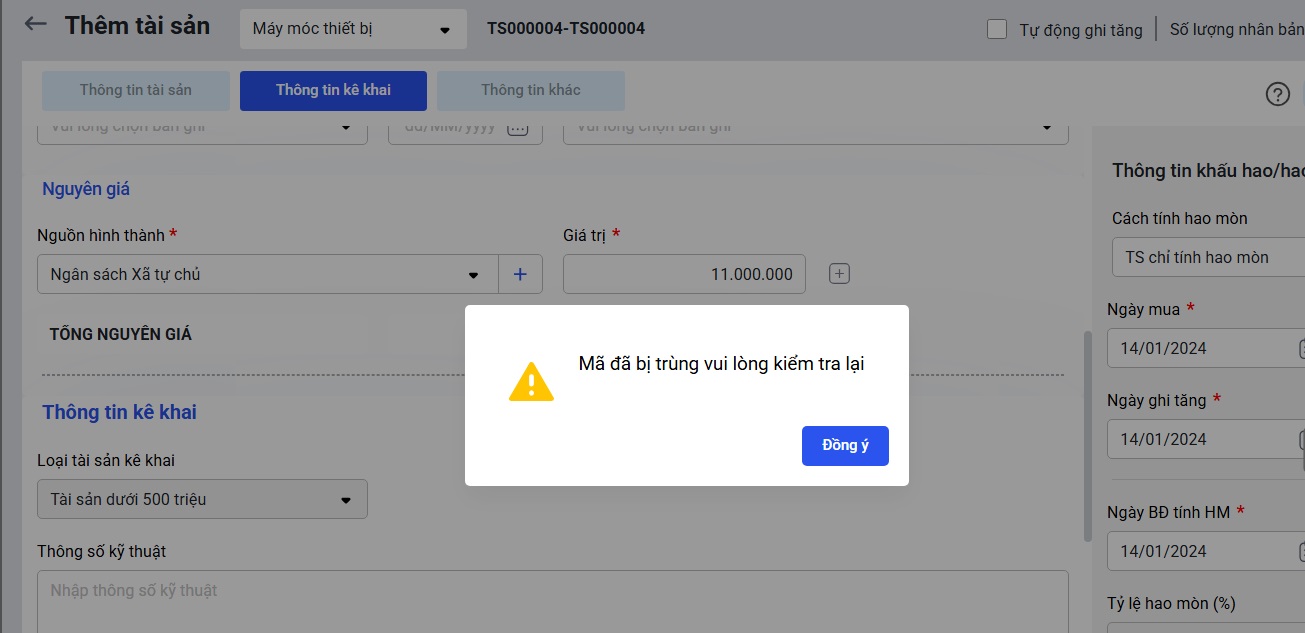 2. Làm thế nào để xử lý lỗi Mã tài sản bị trùng vui lòng kiểm tra lại khi khai báo tài sản