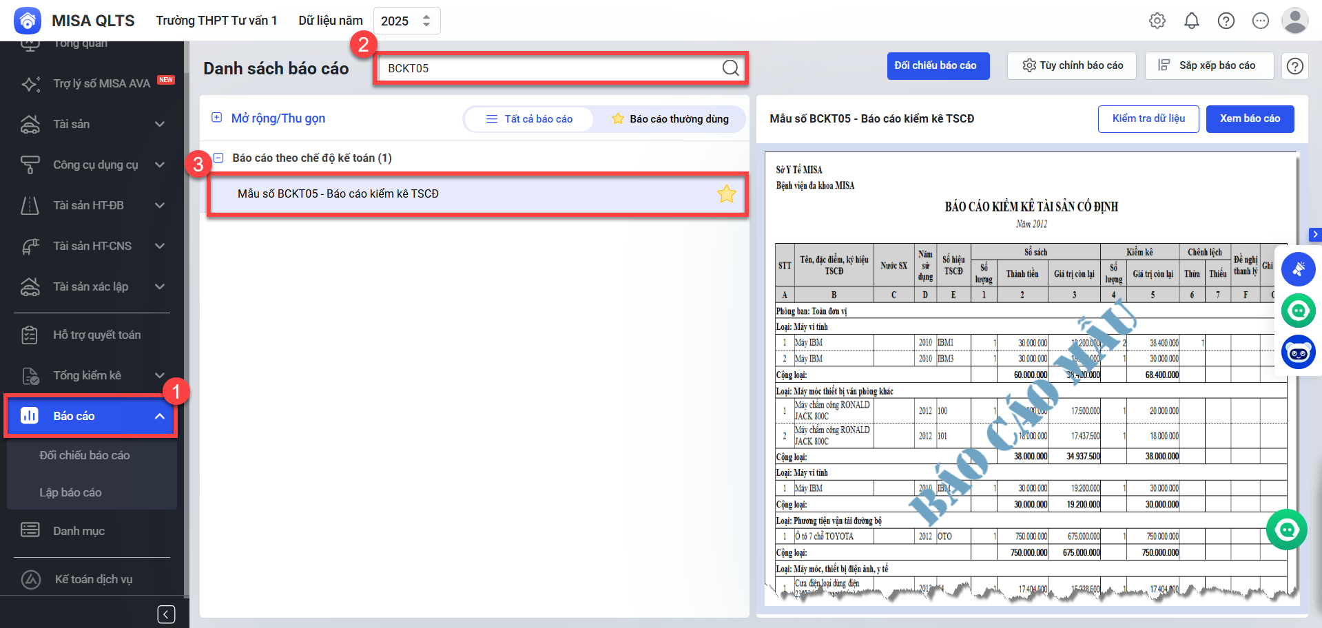 Bước 2: Vào menu Báo cáo\ Tìm và chọn báo cáo Mẫu số BCKT05 – Báo cáo kiểm kê TSCĐ.