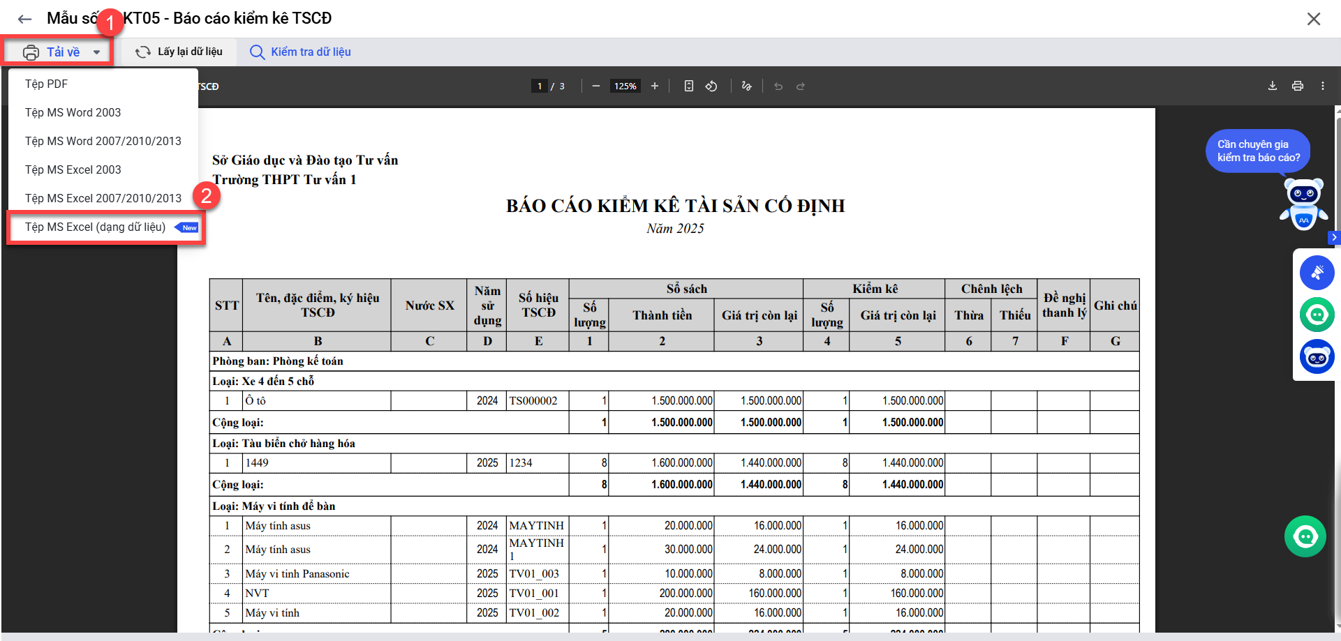 Bước 4: Ở góc trên báo cáo chọn Tải về nhấn Tệp MS Excel (dạng dữ liệu).