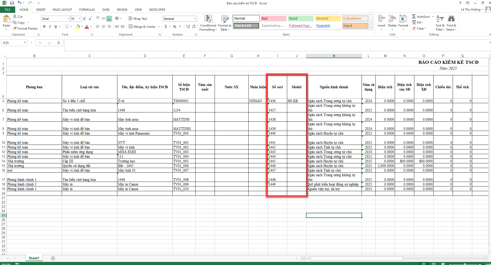 Lưu ý: Thông tin Số seri, Model chỉ xuất hiện khi tài sản đã được khai báo seri, Model trong danh sách tài sản. Nếu tài sản chưa có seri, Model anh/chị vào menu Tài sản\Chọn tài sản\ Sửa bổ sung trường Số seri, Model, sau đó xuất lại báo cáo BCKT05 dưới dạng Excel để xem.