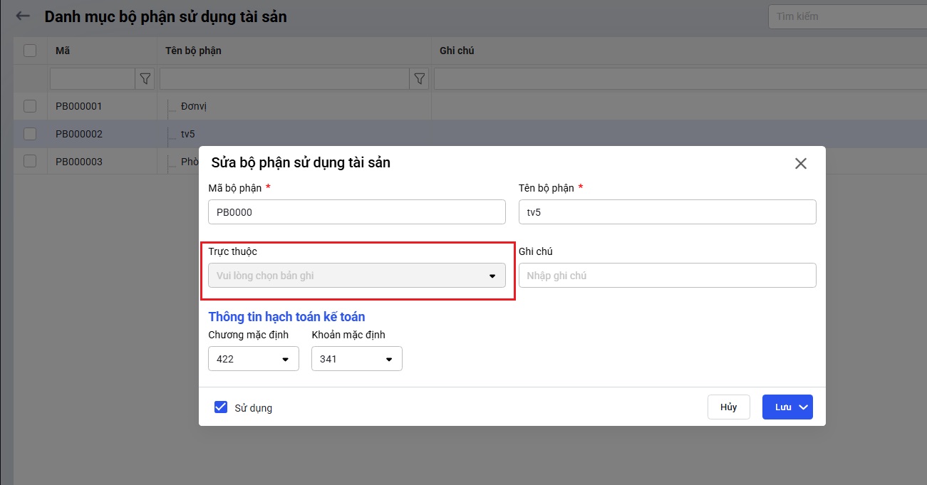 - Cách xử lý: Anh/chị cần thêm phòng ban, khi khai báo cần chọn đúng phòng ban cha tại ô Trực thuộc và điều chuyển TSCĐ/CCDC từ phòng ban cũ sang phòng ban mới theo hướng dẫn chi tiết sau: