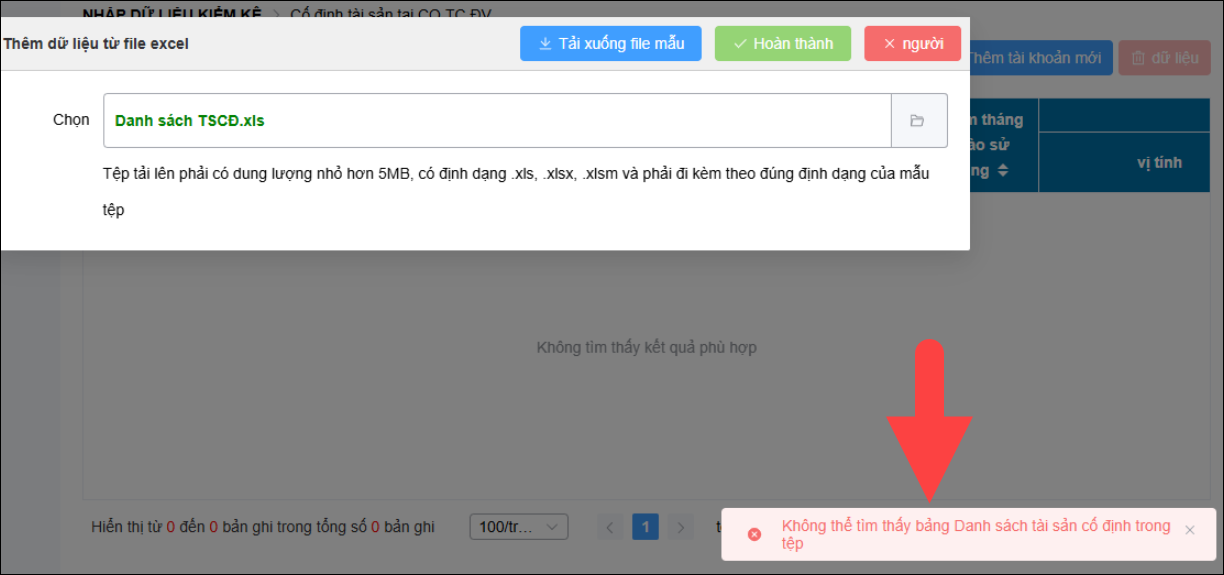 2.6. Nhập khẩu báo lỗi “Không thể tìm thấy bảng Danh sách tài sản cố định trong tệp”