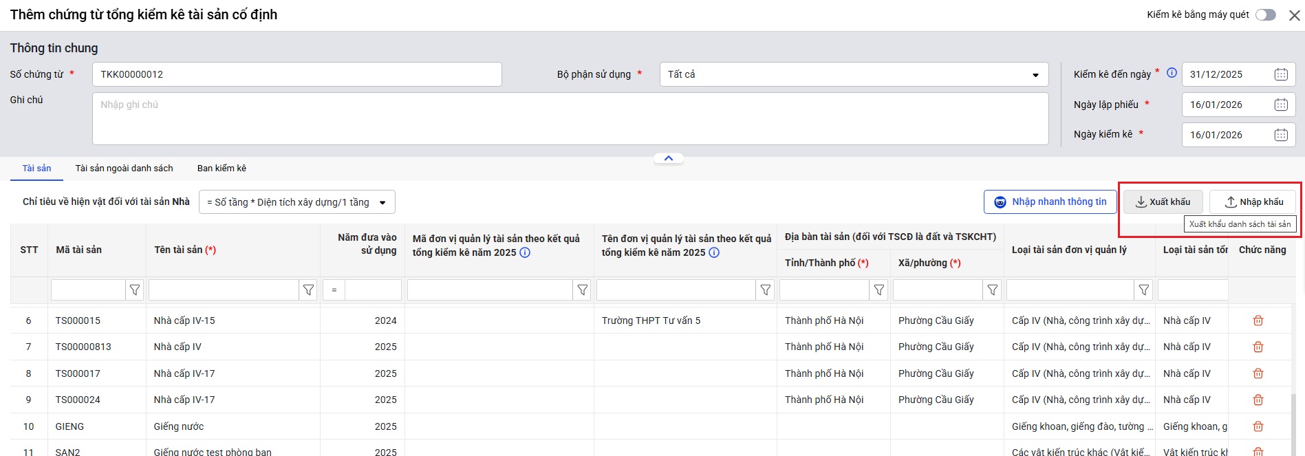 - Hoặc xuất khẩu excel không hiện biên bản tổng kiểm kê mà lại lên danh sách tài sản