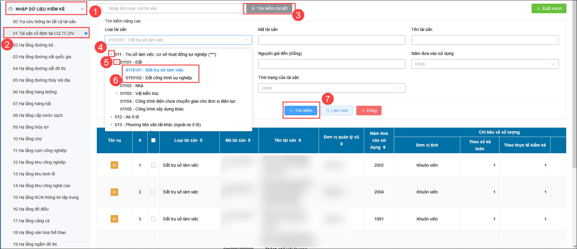 - Trên danh sách tài sản, anh/chị nhấn Tìm kiếm chi tiết, nhấn chuột vào phần Loại tài sản, tích mũi tên vào Loại 011 – Trụ sở làm việc, cơ sở hoạt động sự nghiệp (***). Sau đó tích tiếp vào Loại tài sản con 0110101 – Đất trụ sở làm việc, 0110102 – Đất công trình sự nghiệp.